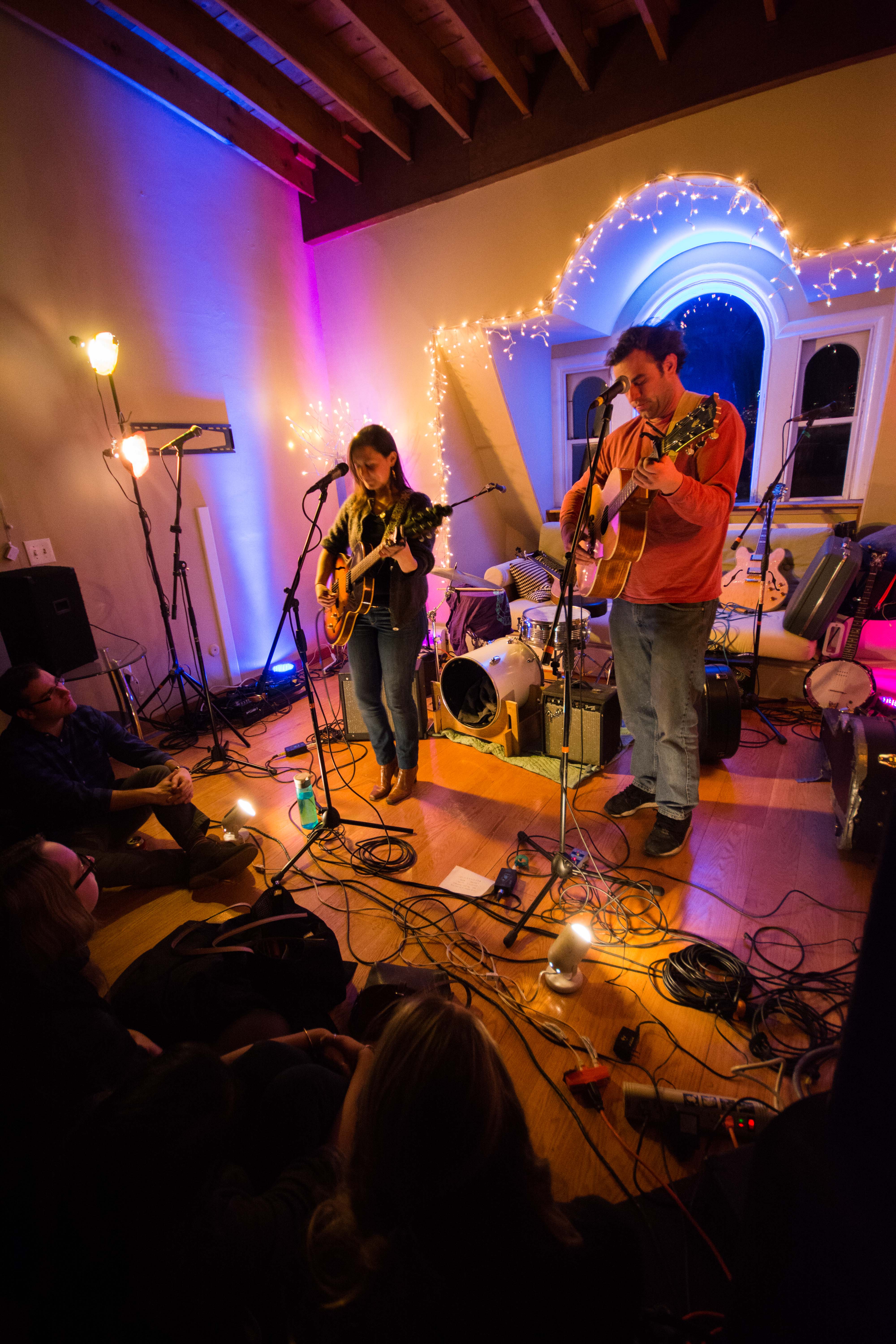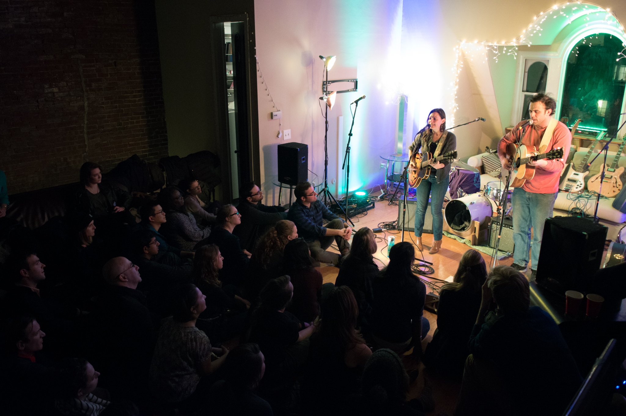 The top floor, where the mystery performers played – Sofar keeps the lineup a secret until you arrive – was an open space that snugly fit over 100 people. A winding staircase led to a windowed tower that overlooked a frosty view of the Boston skyline.