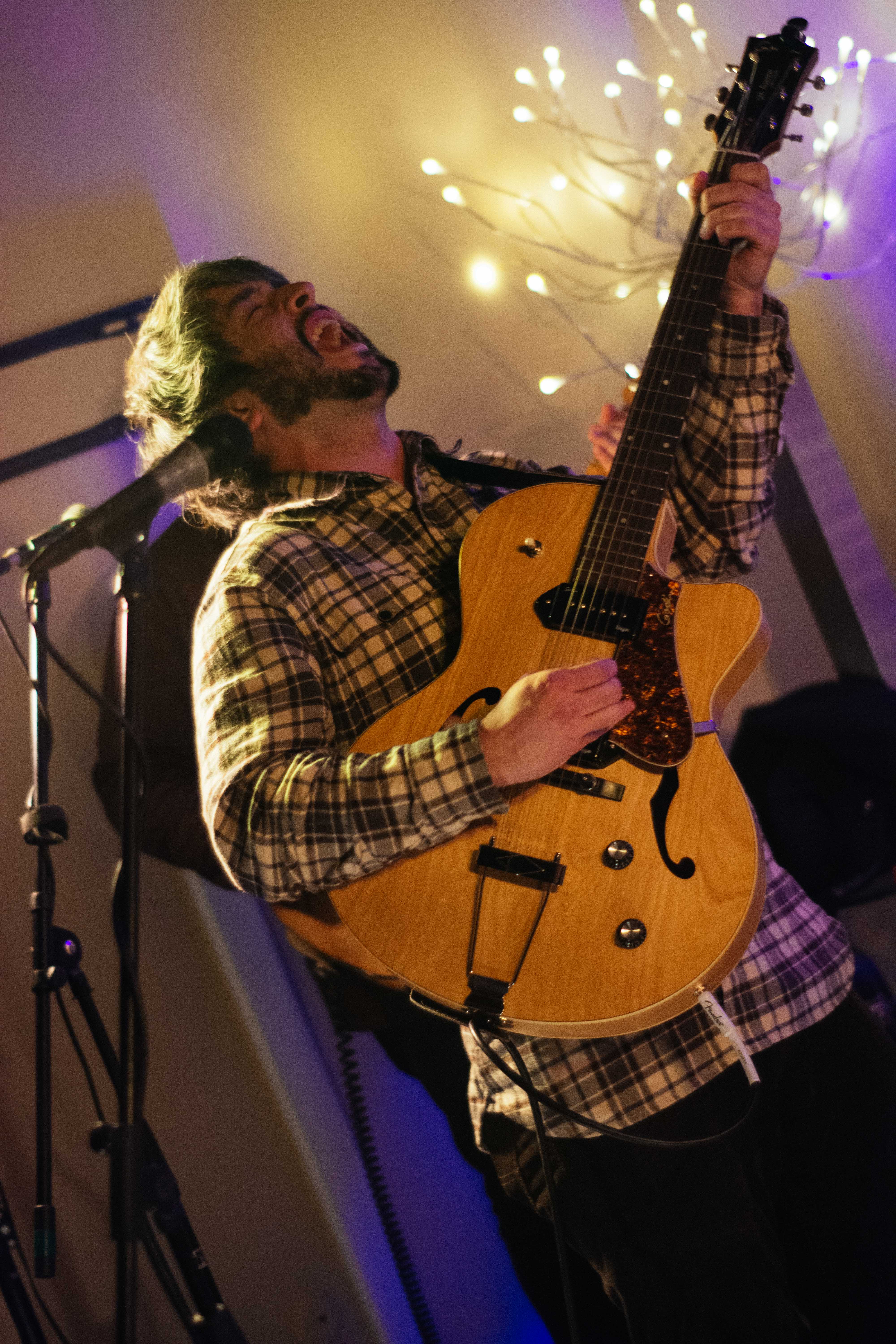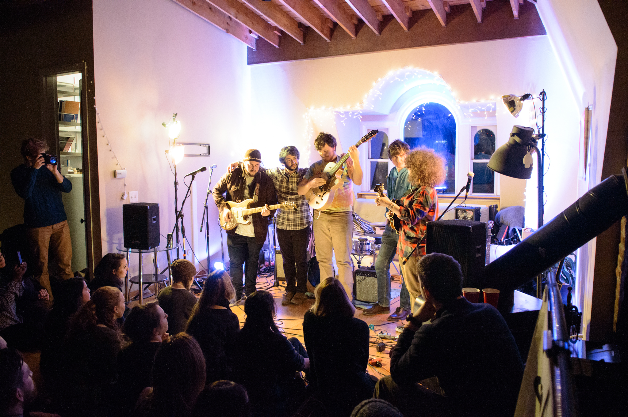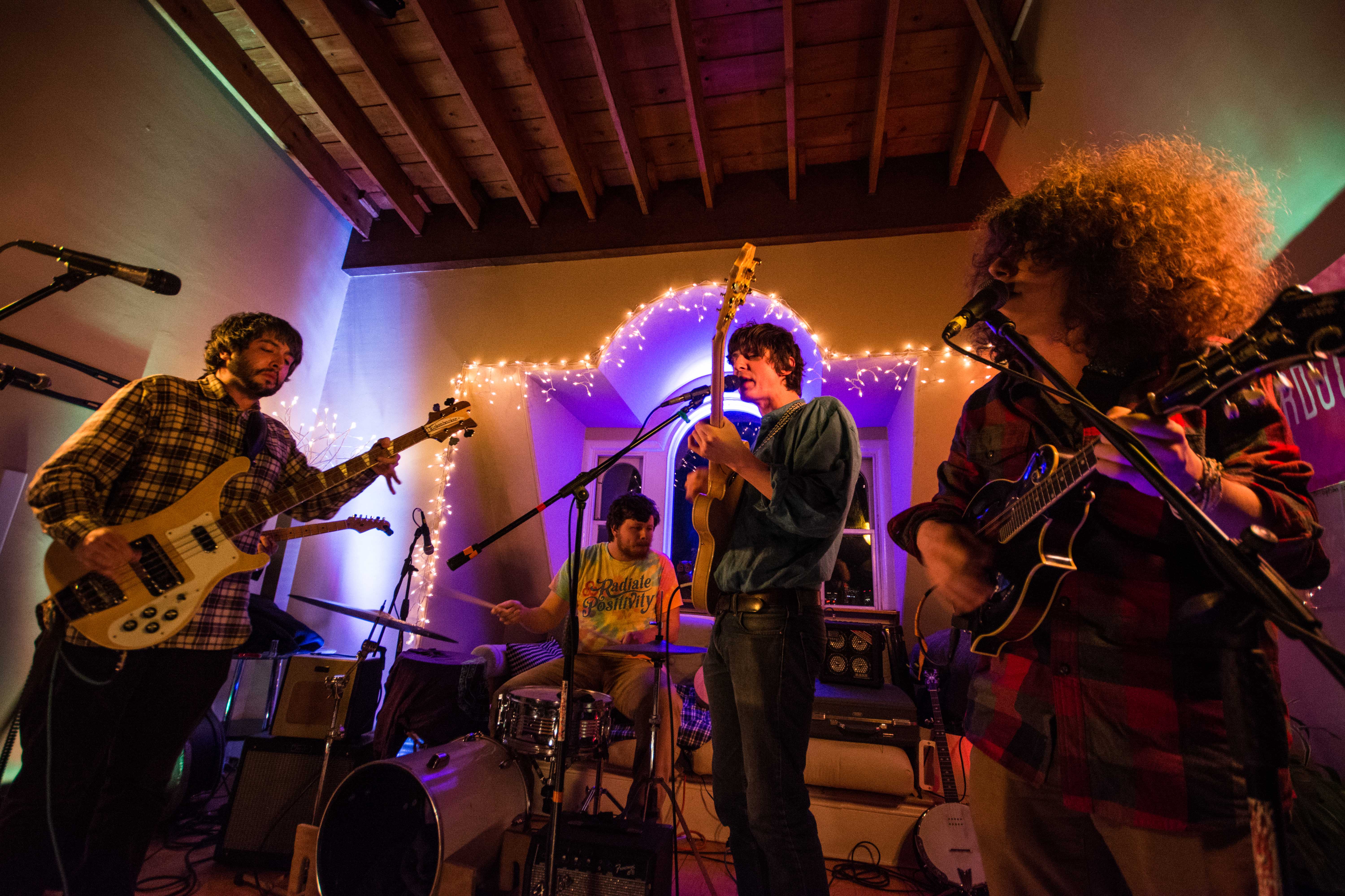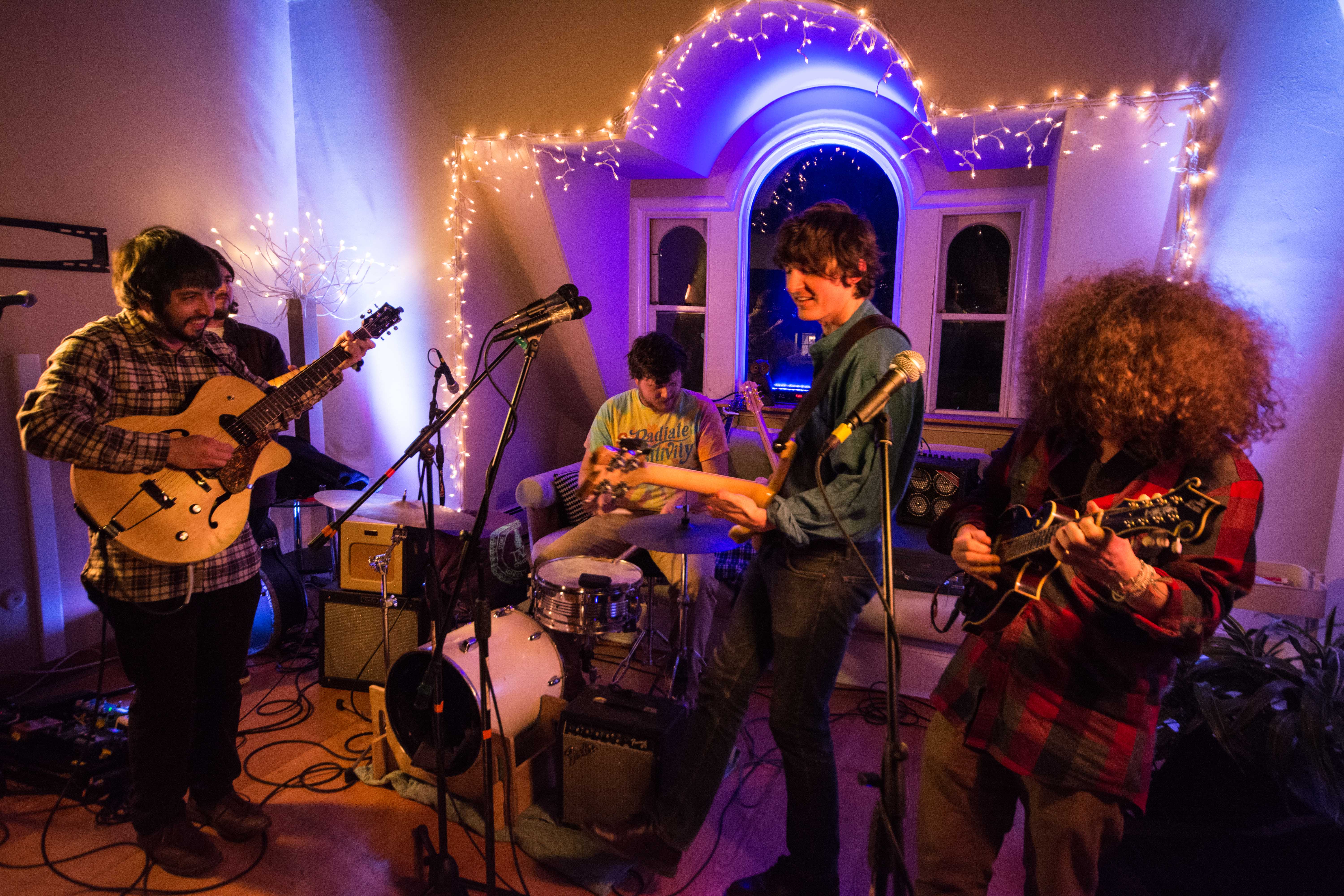 After another short intermission, Grey Season took the floor. The wooden guitars that had rested atop the cream-colored couch were finally put to use. The crowd had sat through the first two sets, customary at Sofar performances, which tend to have a laid-back feel. But with encouragement from Grey Season and a promise to be able to sit back down later, the audience rose to their feet to sway to a frenzy of string strumming.