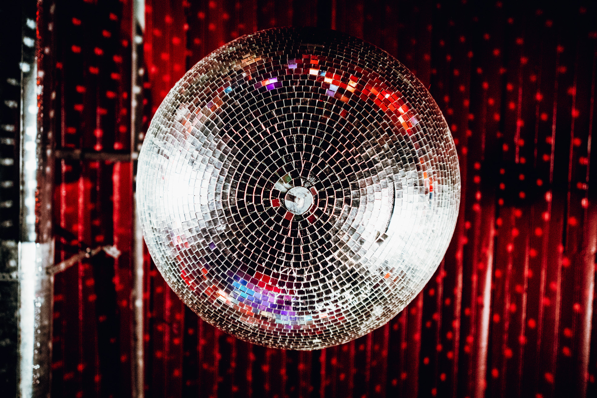 Above the crowd, a disco ball spins and casts tiles of light over performers and patrons at a bar in Nashville, TN.