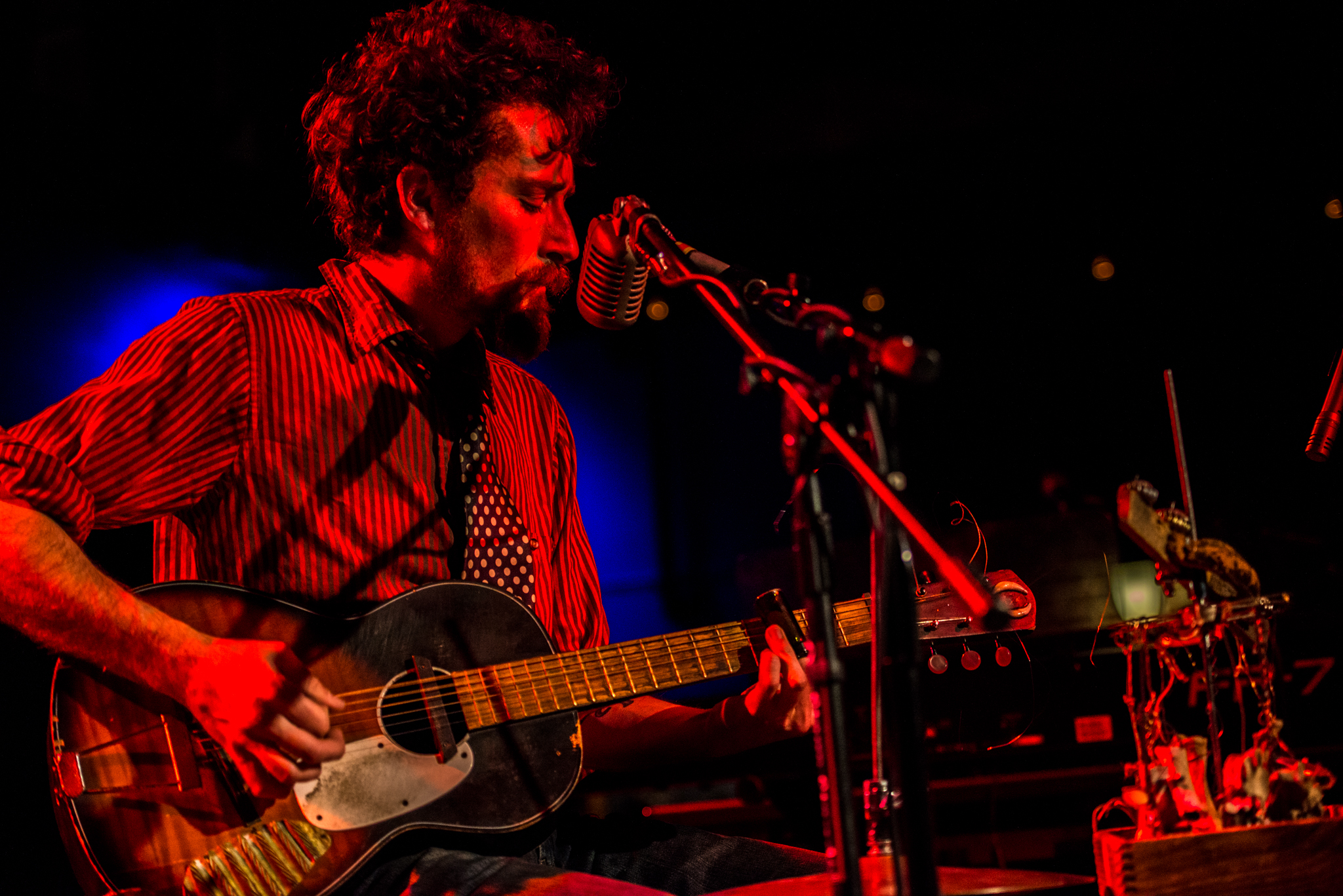 Enter Matt Lorenz (The Suitcase Junket), head full of wild curls, with a neatly twisted and waxed mustache. Sporting a red and black pinstriped shirt and a polka dot tie, he gracefully sat down on his legendary suitcase and got right to playing. The rough and rowdy slide guitar immediately grabbed the attention of those who missed his silent approach to the microphone. Pausing, he introduced his creations, all of which fit neatly inside his suitcase/seat/kick drum.