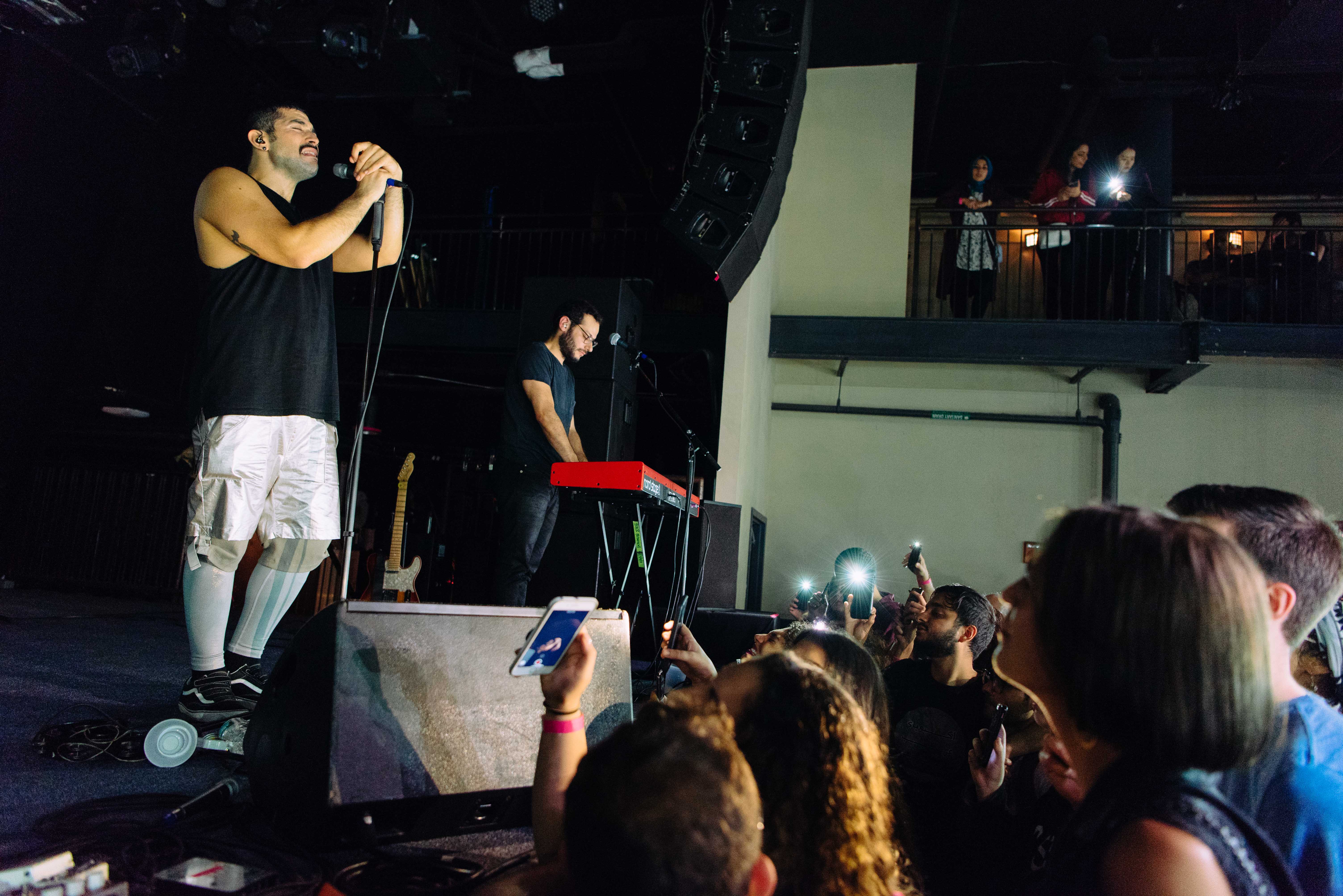 “Shim El Yasmine” on the other hand had opposite sonic intentions, beginning with an acoustic guitar and flowing throughout with Sinno’s somber, yet goosebump-raising voice. Sinno explained, “This song is about the first guy I ever really fell for. [T]his song is about having your heart destroyed by someone.” Despite the Arabic lyrics, one could witness the pain in Sinno’s performance, as he sang, whistled, and eventually throat-sang without a microphone. Sinno walked to the edge of the stage and holding his hand to his throat, riffed in vibrato that only those closest to the stage could hear. For those who could hear his singing, it was a uniquely intimate experience.