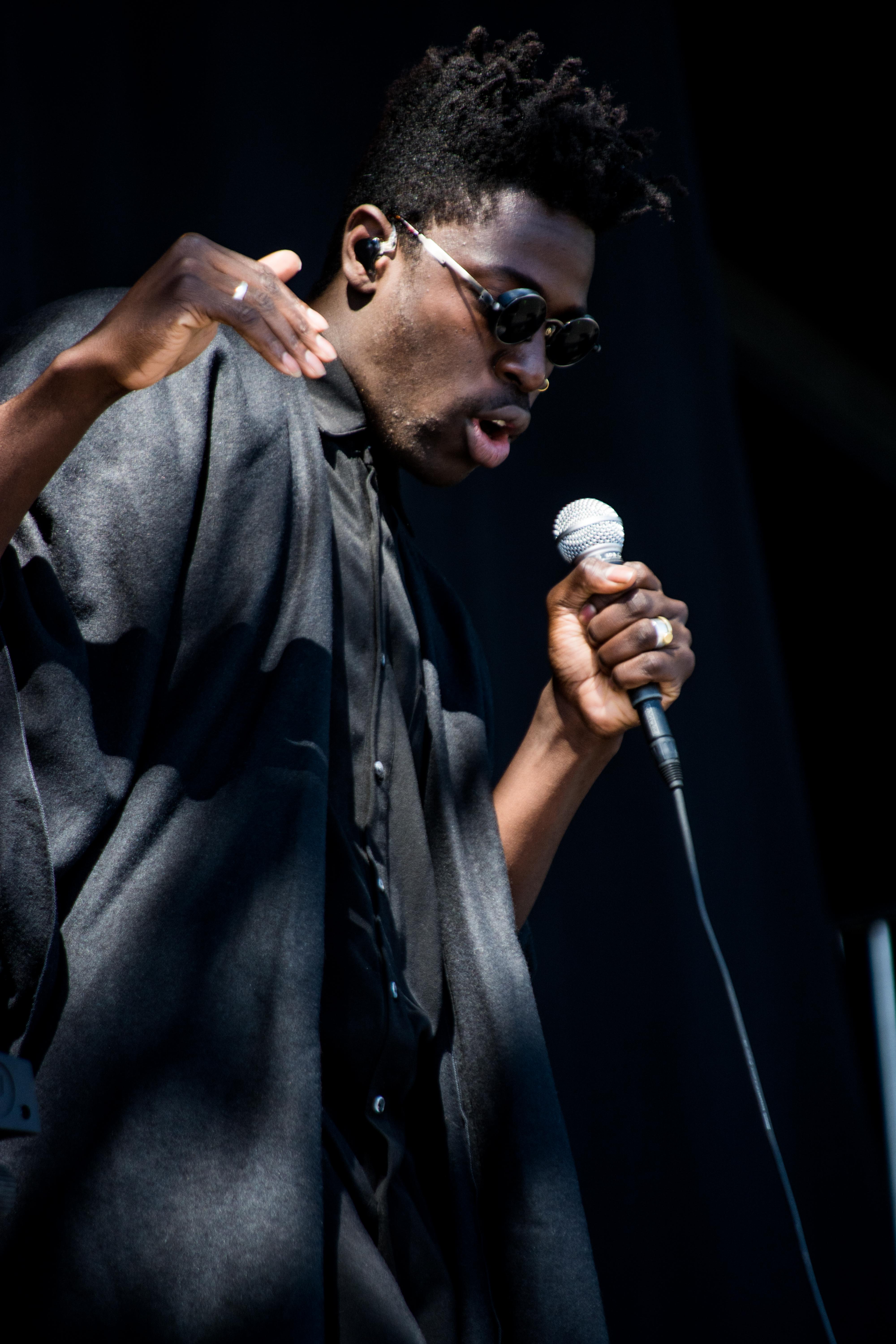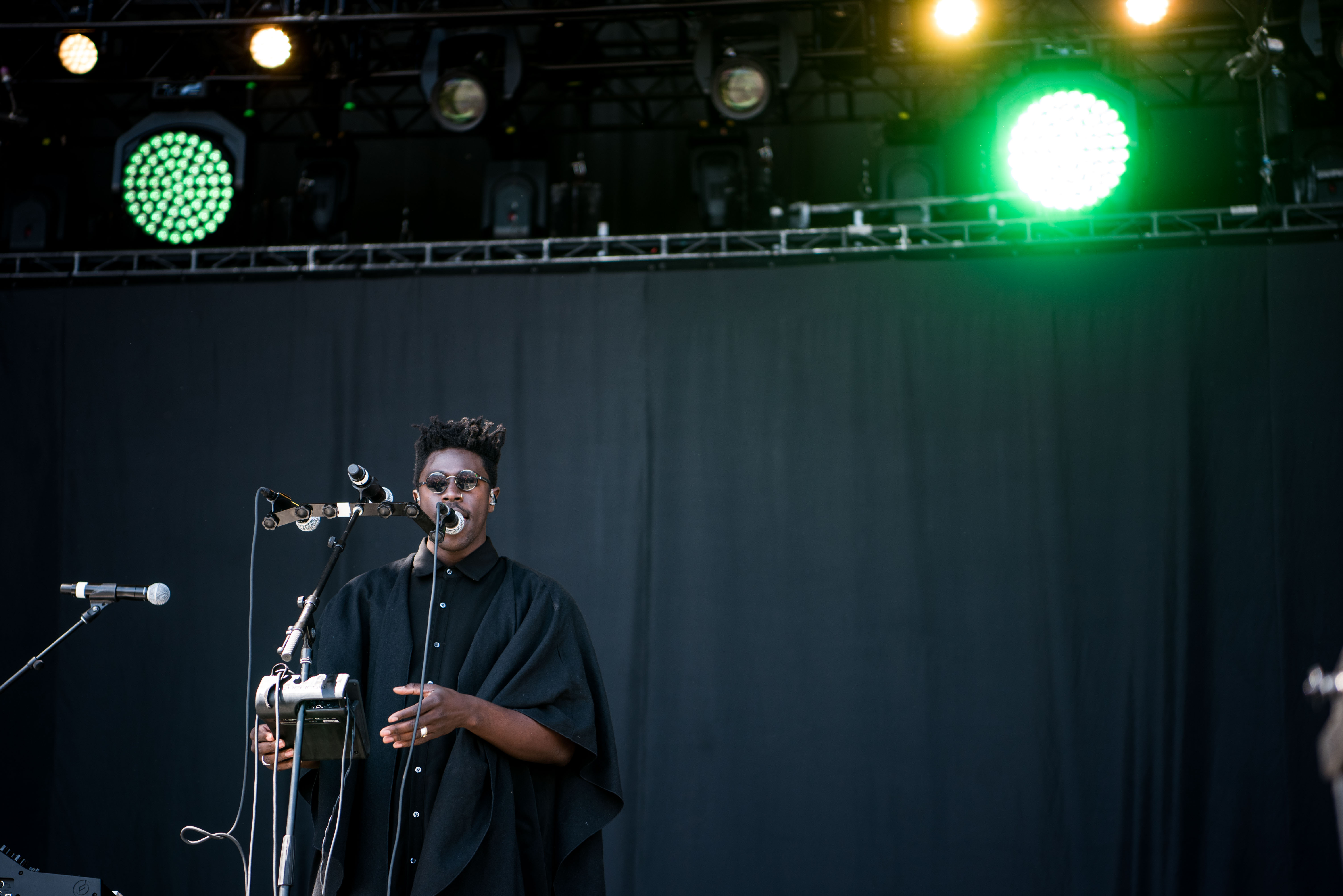 Sporting a baggy, all-black outfit—including a cape that could have been torn from the curtains in the backdrop—Moses Sumney pounded and brushed his palm against the mic, clapped, and snapped in succession to create a landscape of sounds that piled on top of each other. His falsetto, piercing but fluid, echoed as if in a long hallway. During “Worth It,” he swayed with his arms spread out as his voice fluttered from the vocoder.