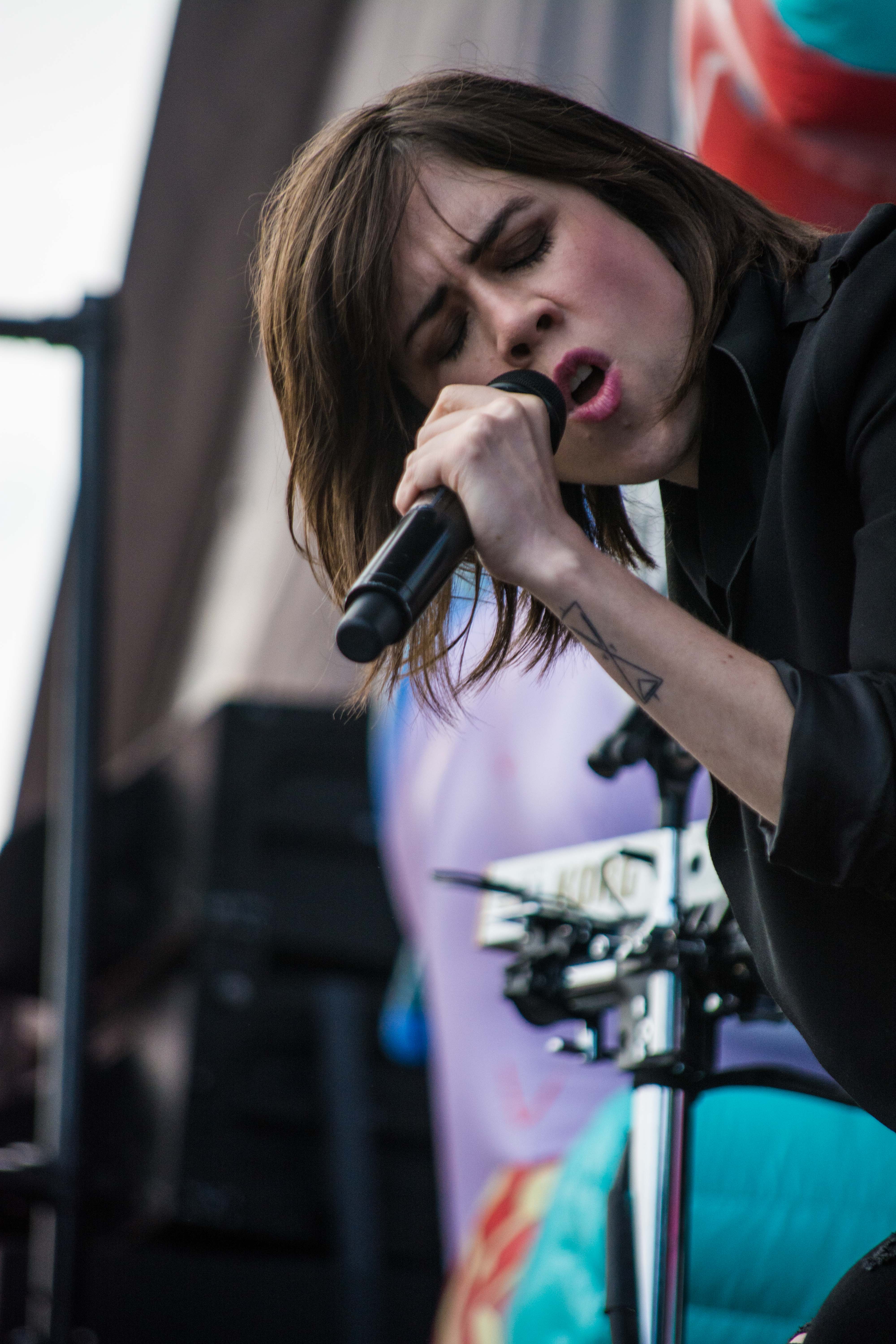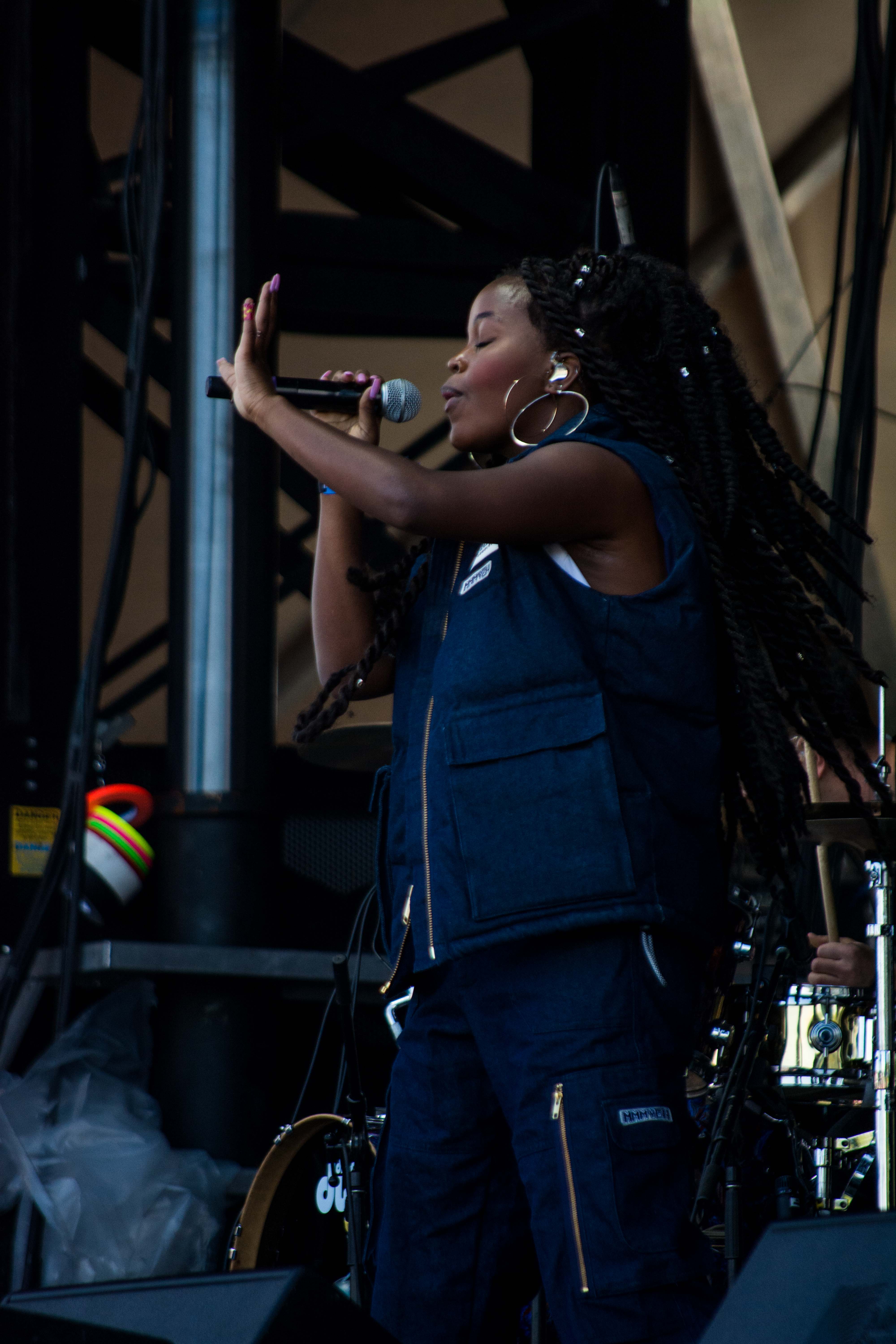 This Zimbabwean-Australian rapper started off Saturday as nature attempted—a bright burst of sunshine peeking out from behind the clouds of yesterday. Her hype man rallied the crowd—surprisingly sizable, considering that Tkay was one of the first sets of the day—and got them chanting her name, pronounced like the letters T and K, as she danced onto the stage. Her songs are threaded with synth pop and punctuated by her snappy, quick fire rapping. She twisted and jumped all over the stage, dancing with her entire body. Her set was short but packed full of energy.