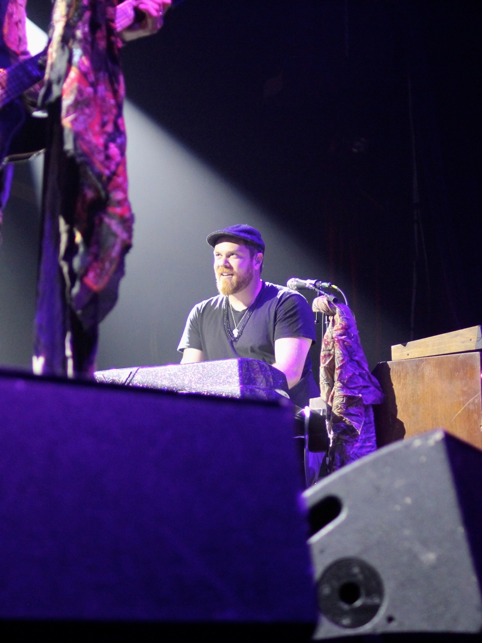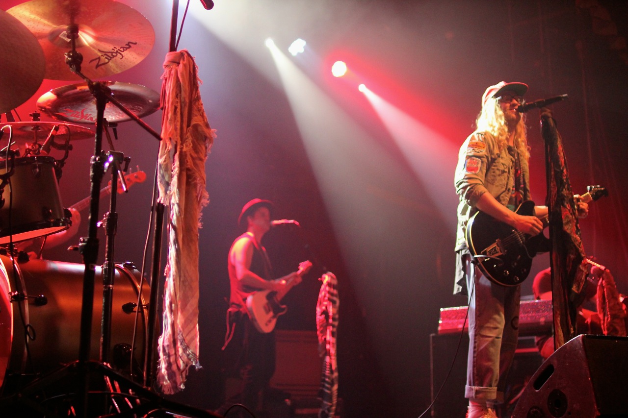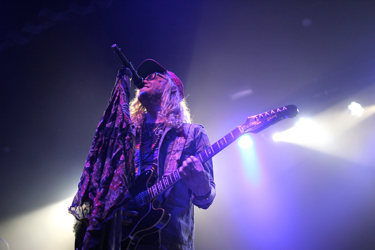 But, a frenetic keyboard solo from Watkins quickly reclaimed the attention of audience members as an eerie purple hue saturated the stage. The LED lights from the exposed back of Watkins Hammond organ added to the light show, shining a ghostly, white light across the stage floor. The first notes of “American Privilege,” Stone’s attack song on American consumerism, rang out. Fans of Stone know he has a passion for social issues, and the audience came to a focused stillness as they listened to Stone’s solemn lesson.