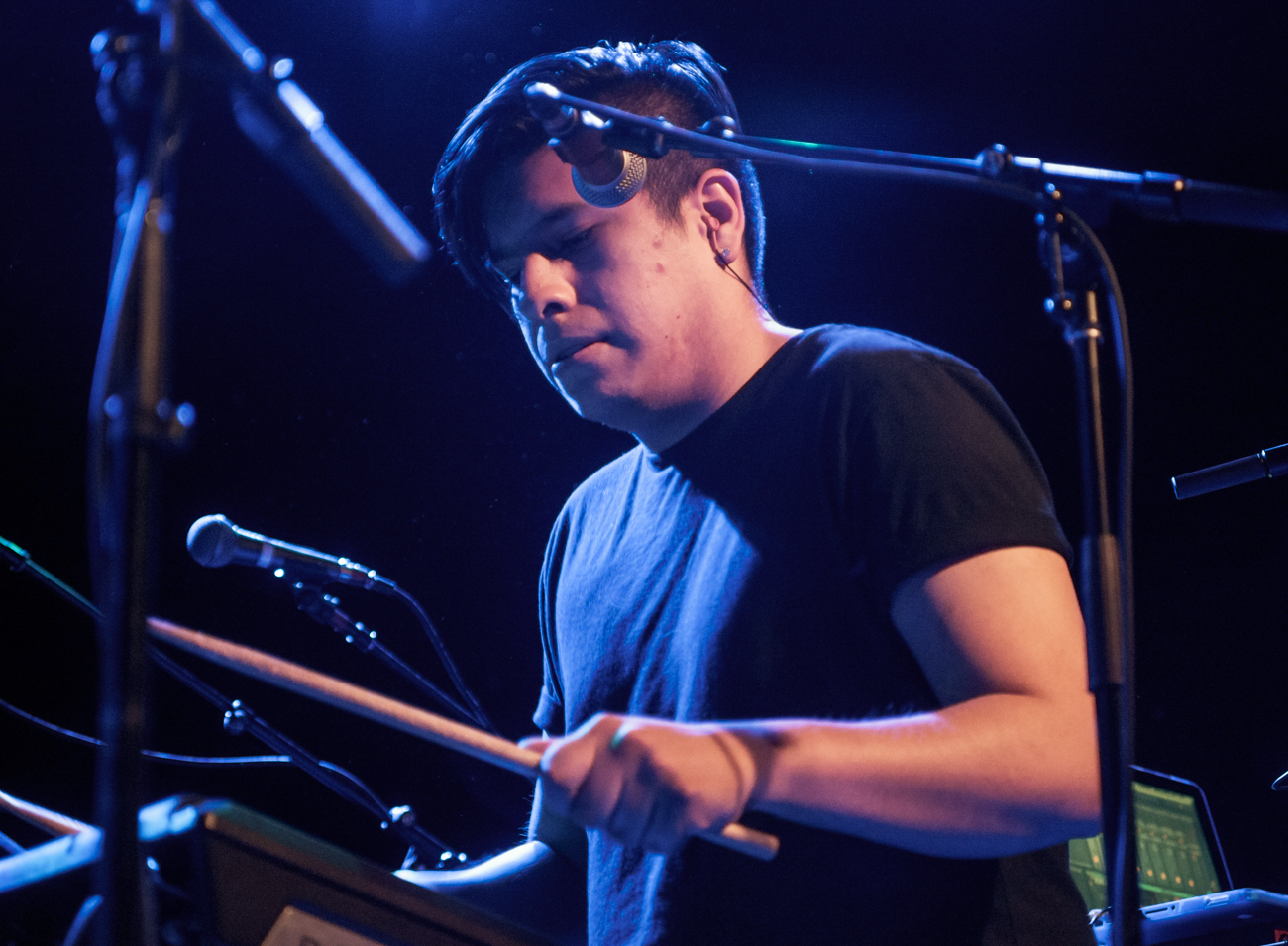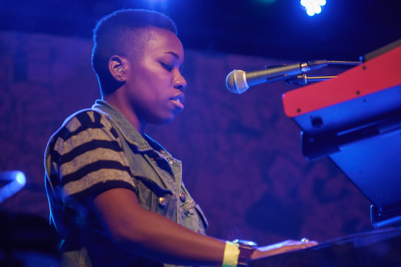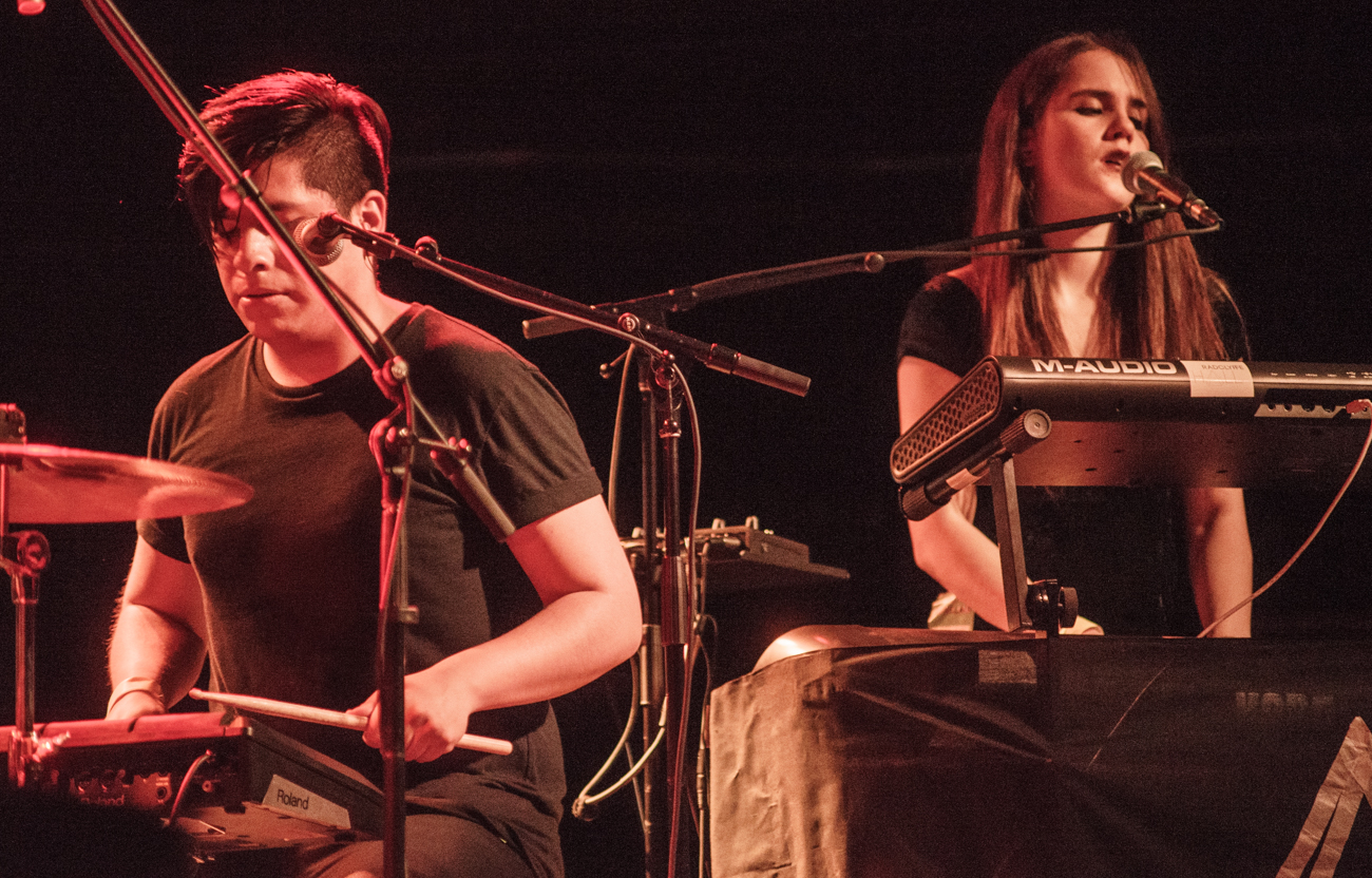 After Radclyffe Hall wrapped up their half-hour set, LA-based duo Baths wasted no time delving into “Miasma Sky” from their sophomore album, Obsidian. At first glance, Baths, comprised of mastermind Will Wiesenfeld and partner Morgan Greenwood, seemed a modest pair equipped with a synth, guitar, and a few sequencers. The vocals got lost behind a haze of jumbled bass and keys for the first couple of songs, contributing to a growing restlessness in the air. It wasn’t until they started tearing into a hidden table of electronic goodies that they proved they aren’t just another electro act fiddling with samples in Mom’s basement.