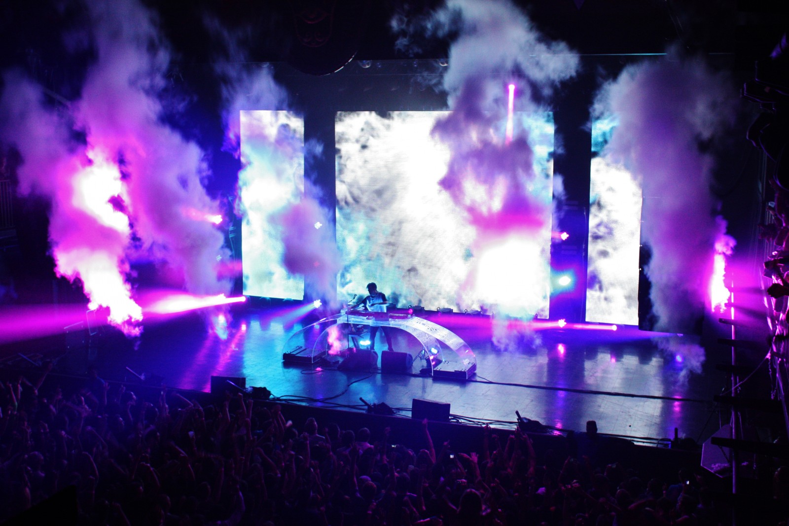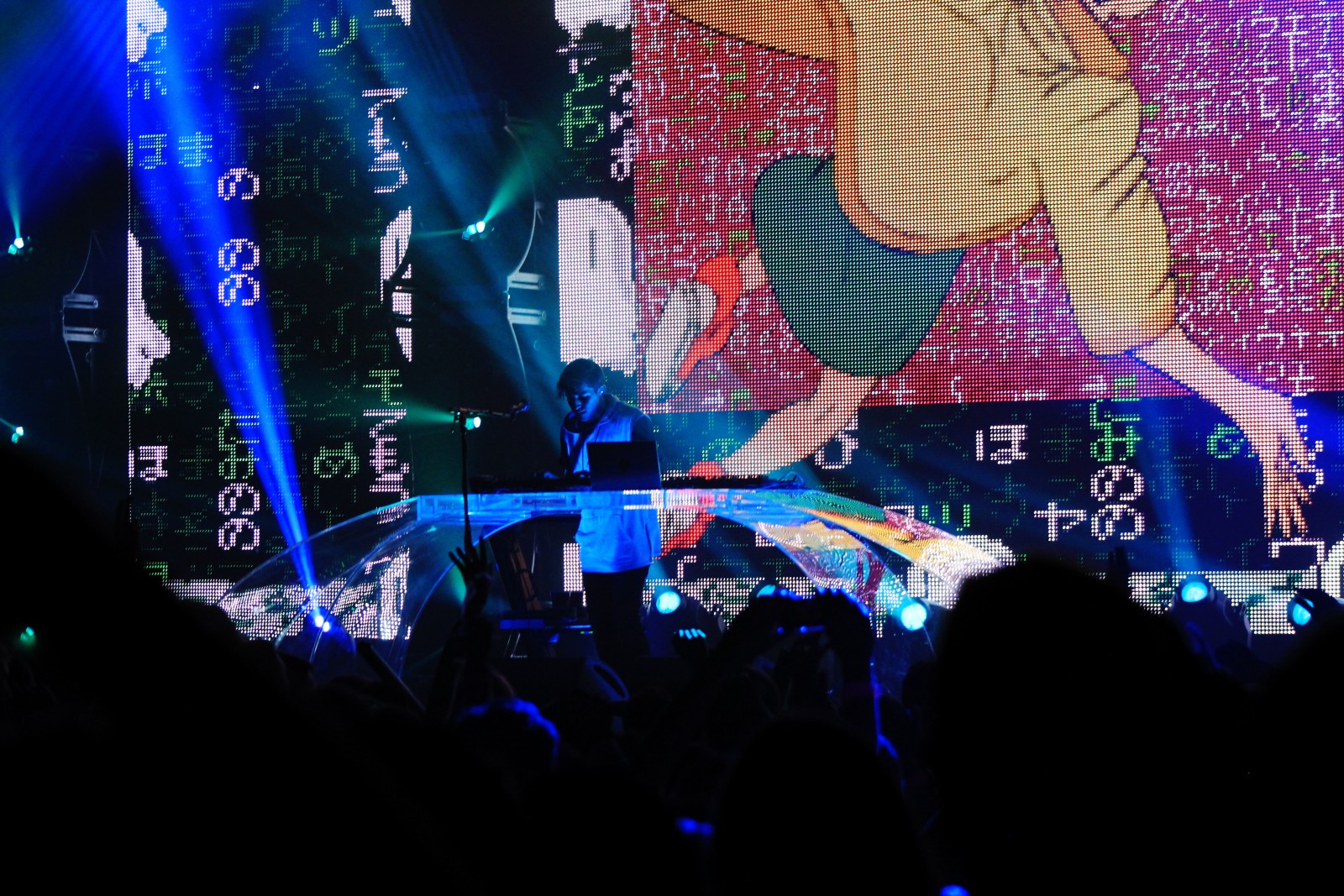 The head technician raises his hand with a thumbs up, signaling to the light team in back. The blue light fades to a lonely single beam, the crowd roars, and Porter Robinson takes the stage.