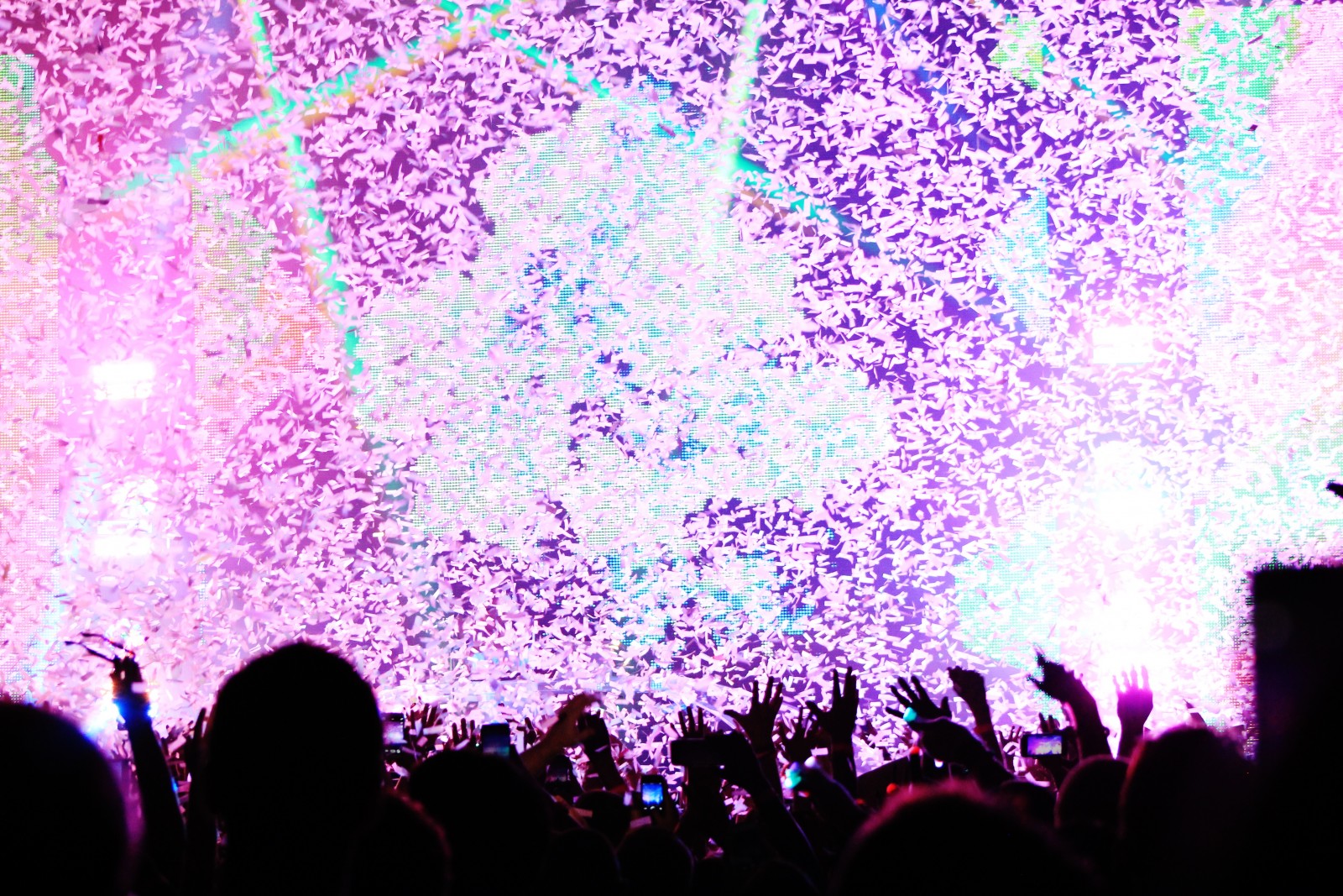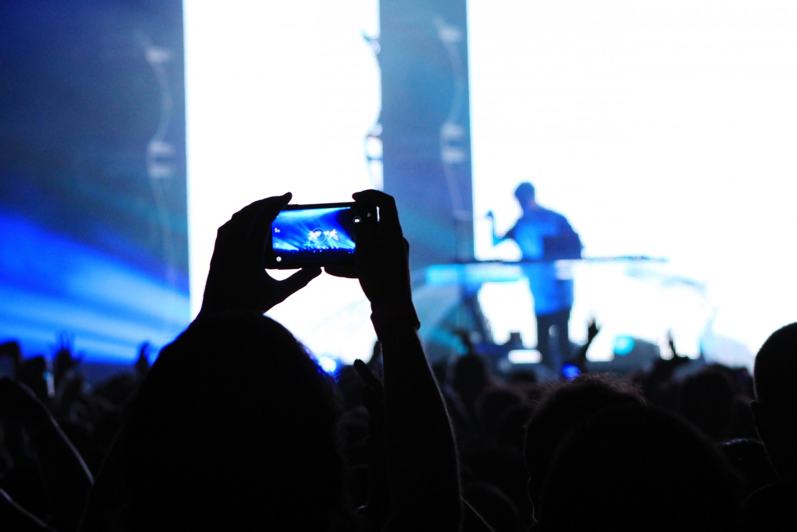 Cellphone camera lights pepper the audience, illuminating the darkness like a glowing mass of fireflies. The Snapchat race has begun.