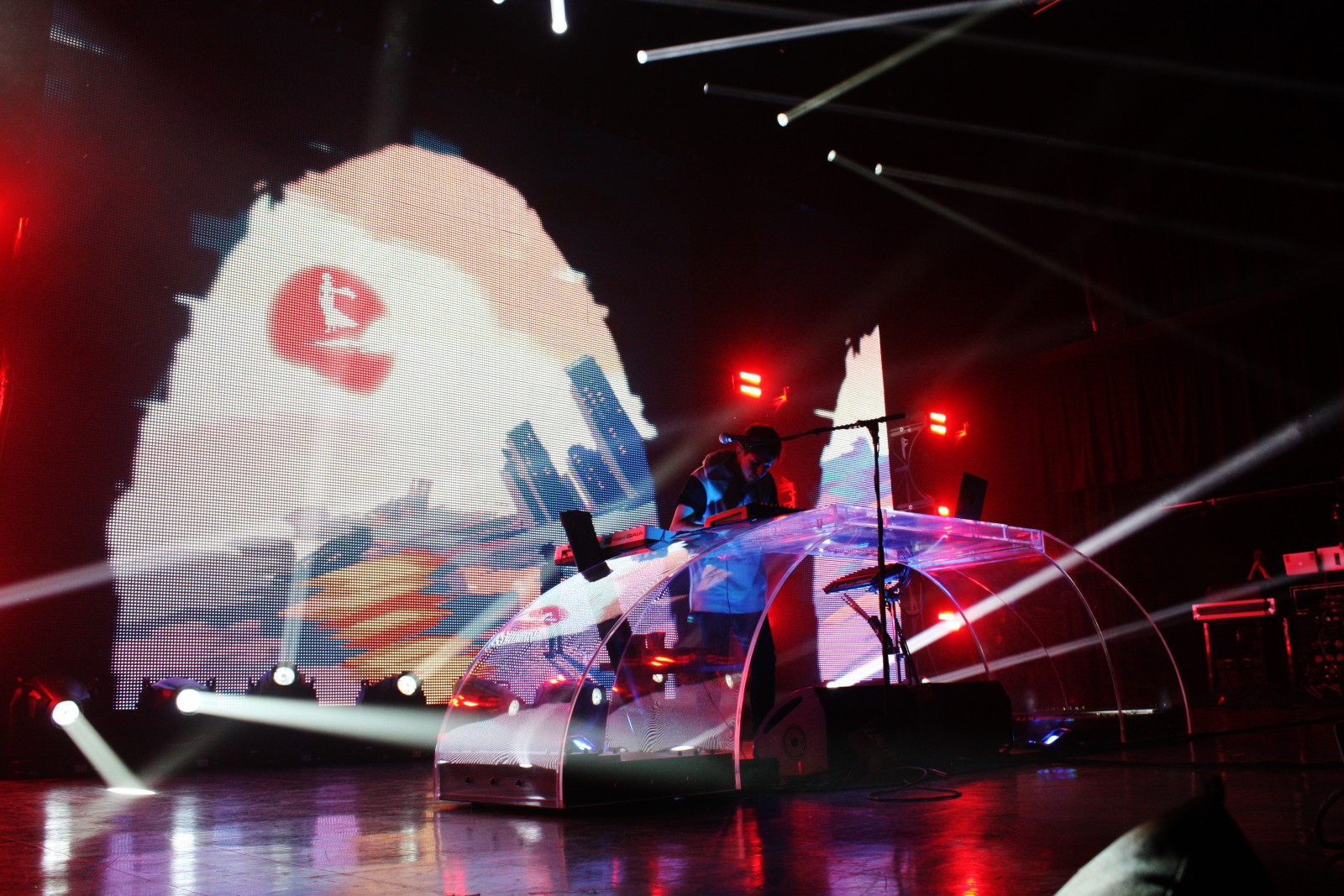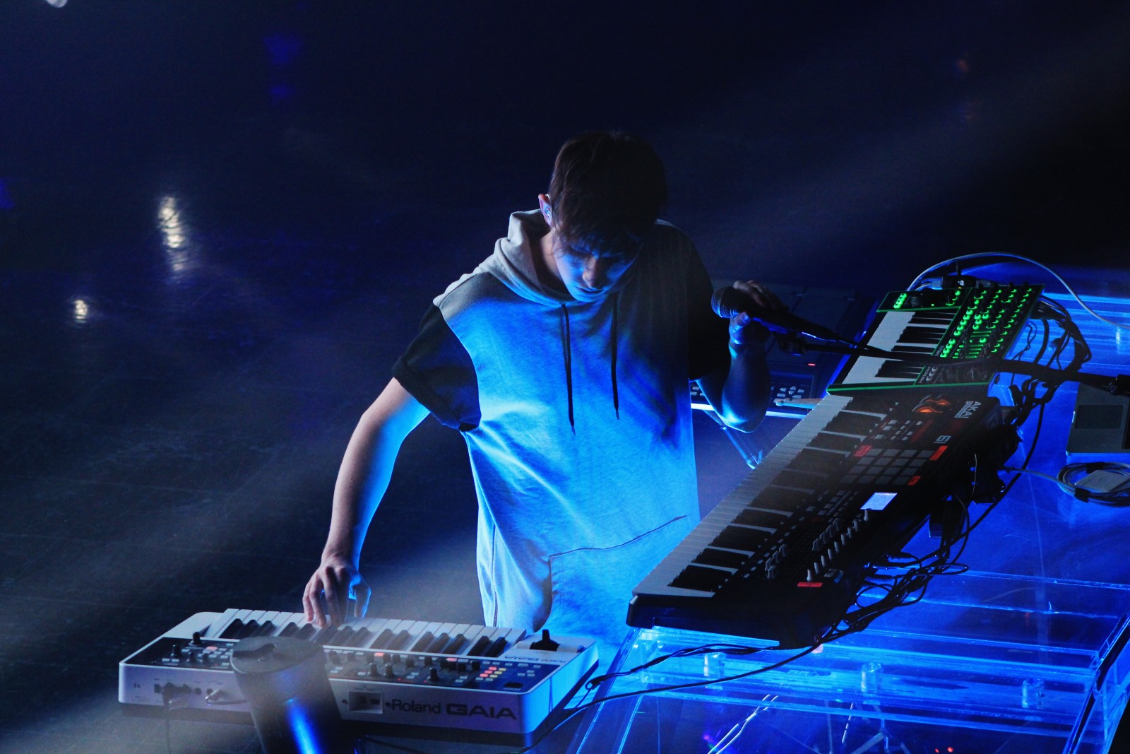 Inside, the venue is dark except for an empty stage bathed in blue light, shining down on a curved LED table holding three keyboards and a laptop. Fixed to the front of the table is a microphone.