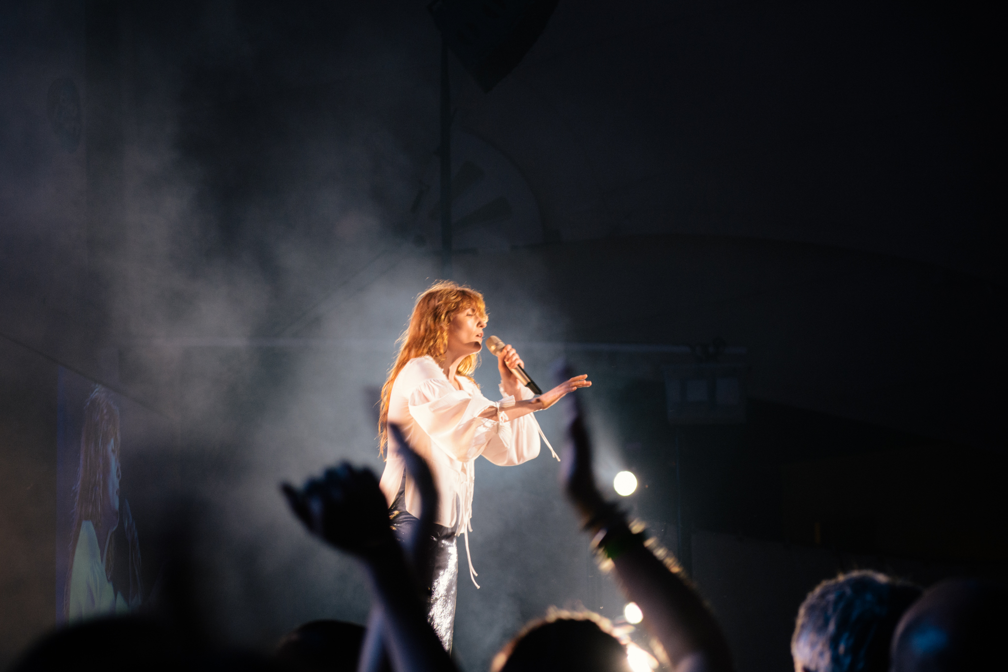Her lower half was a glittering ocean blue, and her wavy red hair flowed behind her. Miss Florence Welch made a home for herself inside the white clamshell that is Blue Hills Bank Pavilion.