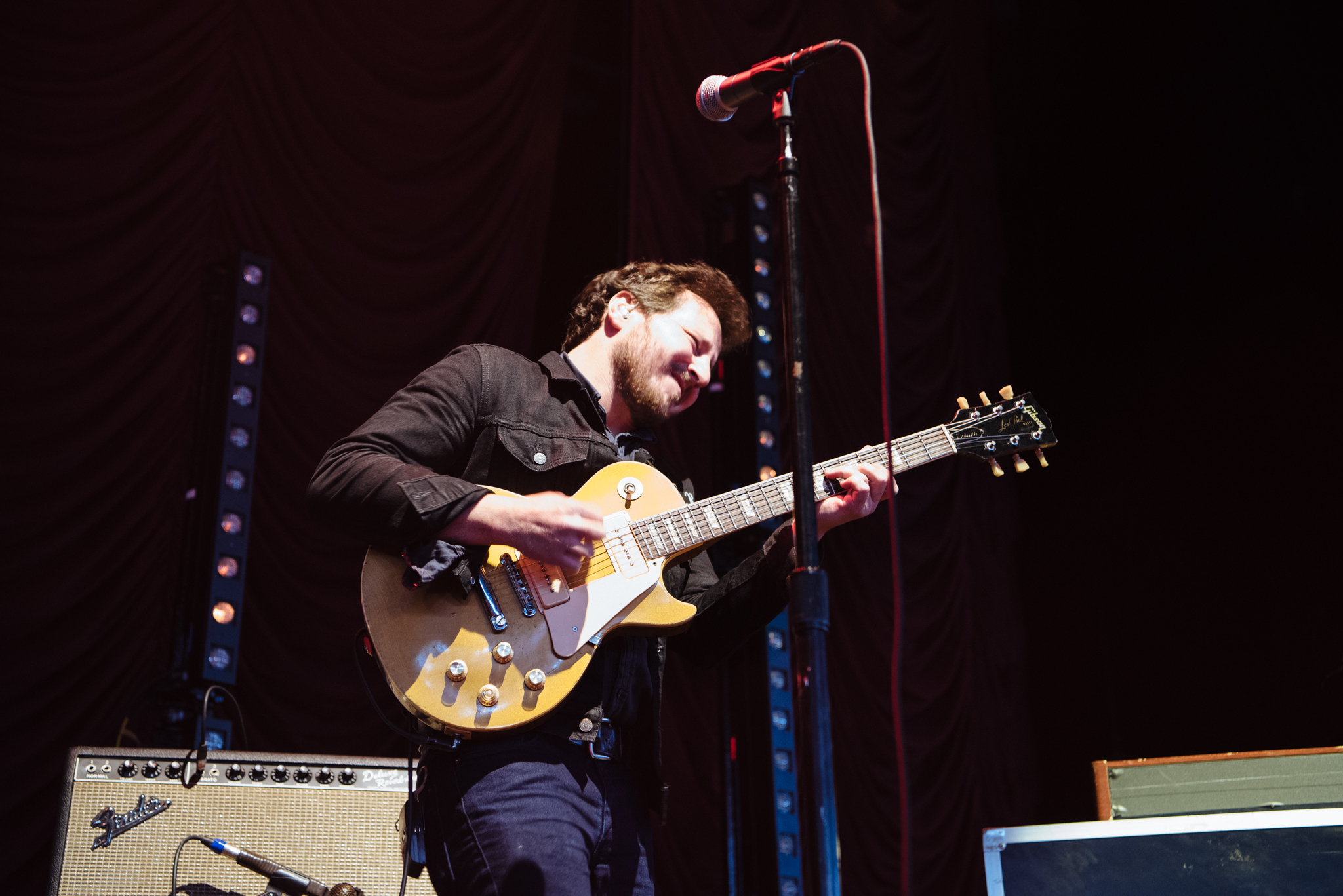 The other guitarists joined in before turning their backs and leaning up against the speakers to hit the audience with a building wave of static and noise. Though throughout their performance the band members often added extra layers of sound to each song, they managed to make the music feel more like the purposeful layering of jamming jazz musicians than the rowdy ruckus of the neighborhood garage band. At the end of the song, Rateliff tossed his white guitar into the air, caught by the stage crew. The red curtains were doused in blue light, turning a deep purple.