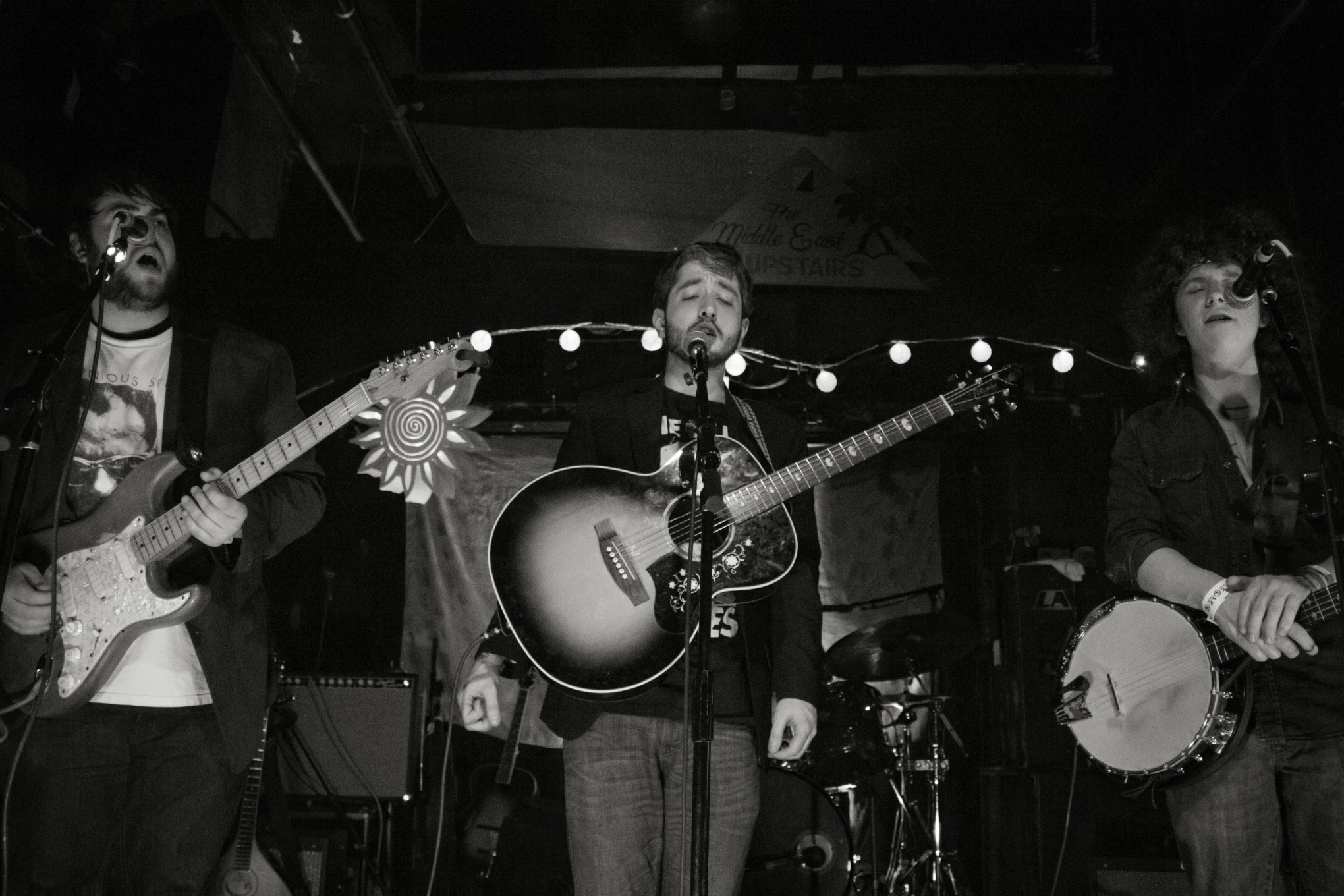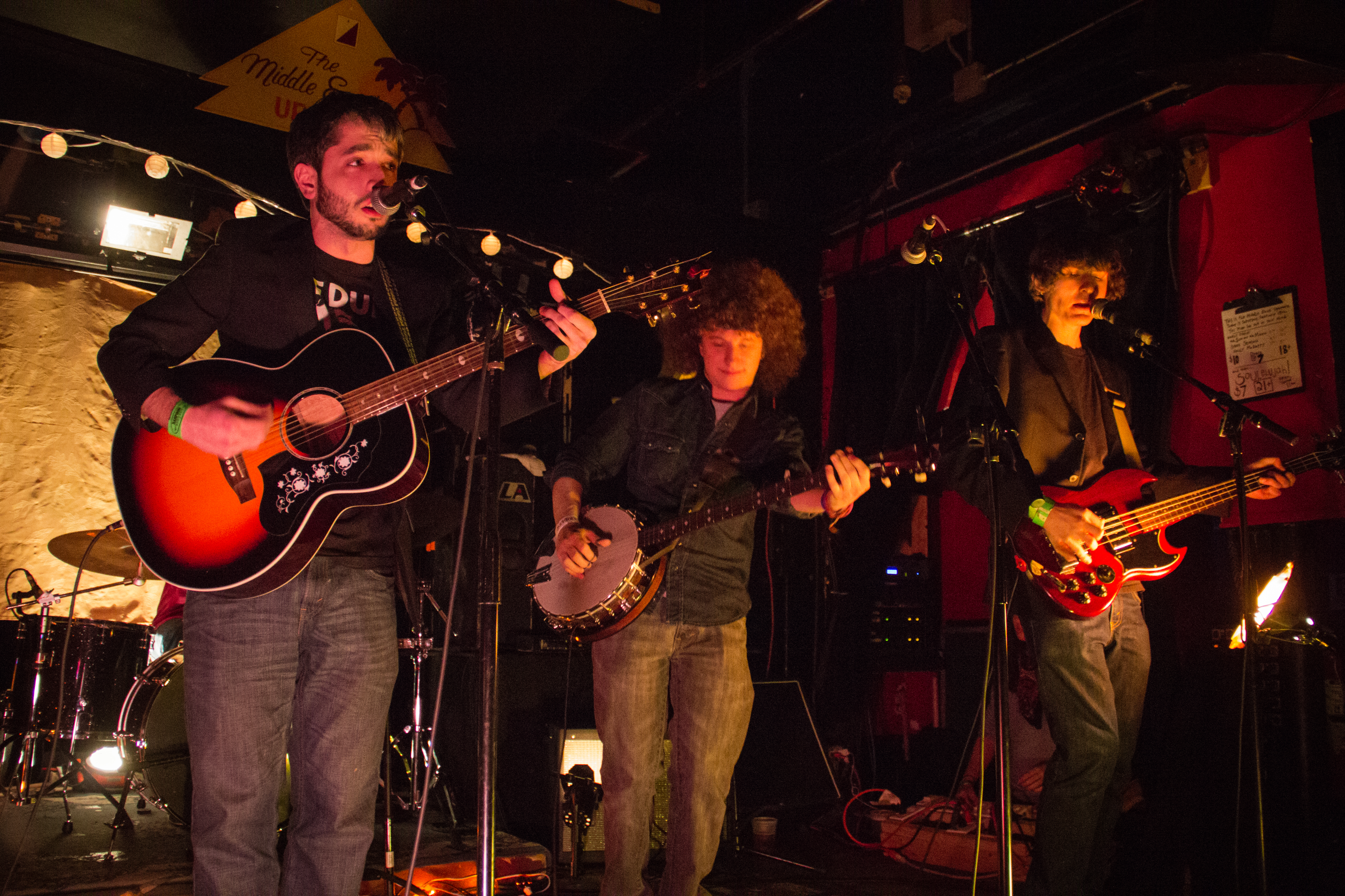 The general atmosphere of the Middle East felt like the inside of a pillow fort. Little paper lanterns hung on the archway underneath the Middle East sign, connecting two larger paper lanterns — a sun on the left and a moon on the right. Although this was most likely a literal interpretation of the name of the band playing next, The Sun And The Moon, the cozy ambience it created matched Grey Season’s style very well. The lights dimmed and faded to the beat of the music, adding a visual energy to the band’s musical energy on stage.
