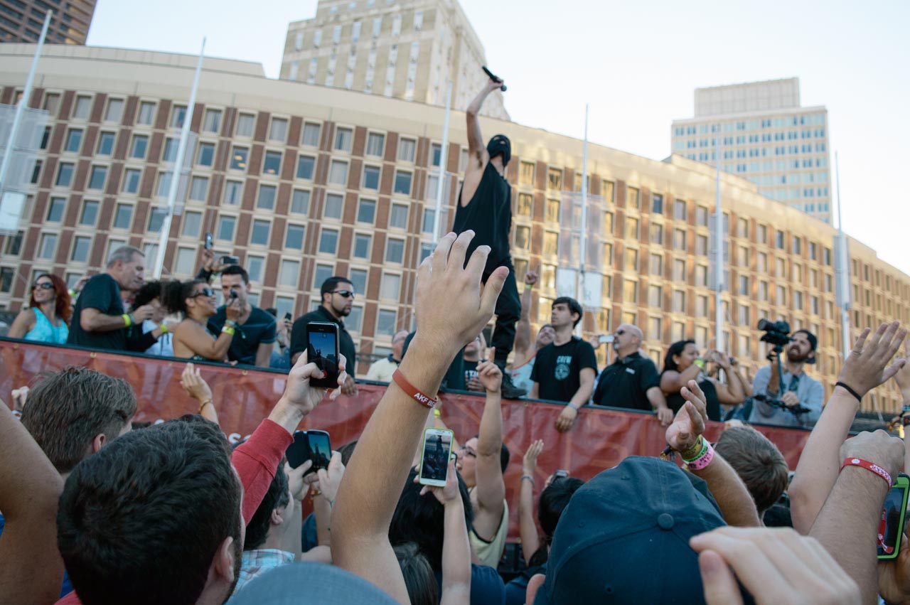 Spastic, brick-rattling, and bursting with color, Twenty One Pilots are the Cirque du Soleil of live music. Acrobats Tyler Joseph and Josh Dun made City Hall Plaza their personal jungle gym, engaging audience members better than any other performer at the festival.