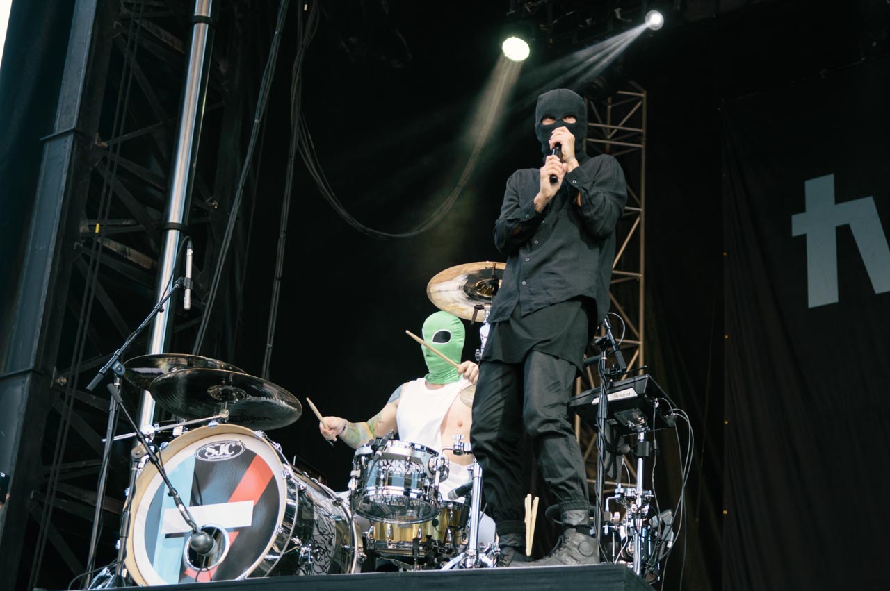 Two masked men sieged the stage Sunday afternoon, pulling stunts like beating water-filled drums held up by fans in the crowd, standing on the railing of the VIP section, and hurtling over the upright piano as smoke machines erupted and the beat dropped.