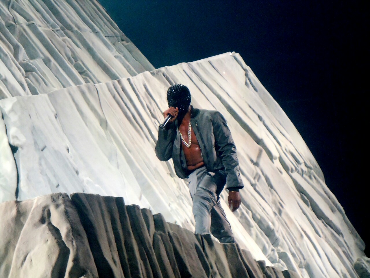 • He wore jeweled face masks and didn’t show his face until the last few songs
