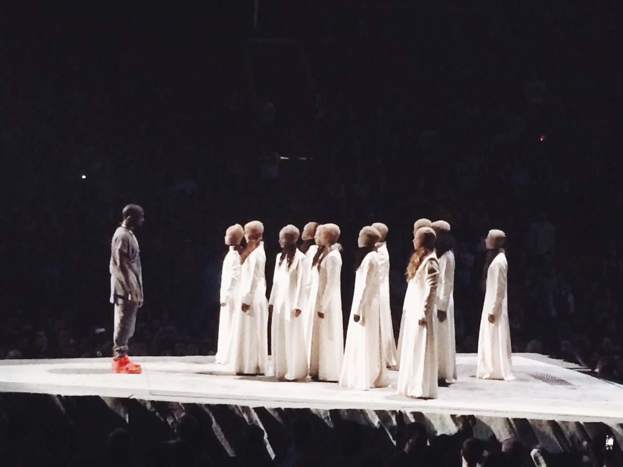 • Kanye’s twelve dancers/disciples surrounded him, carried him around, stood on a mountain, and lit flares