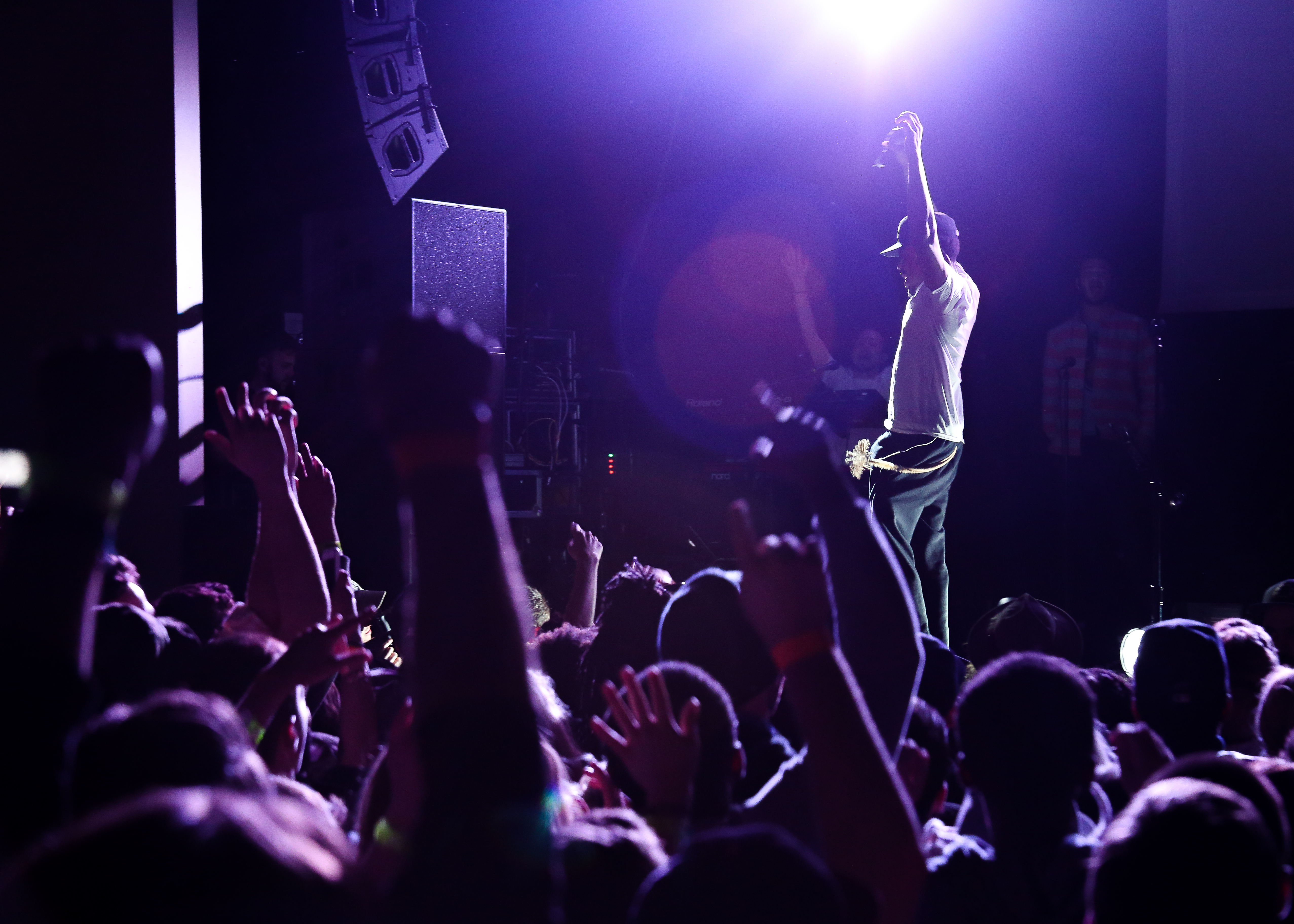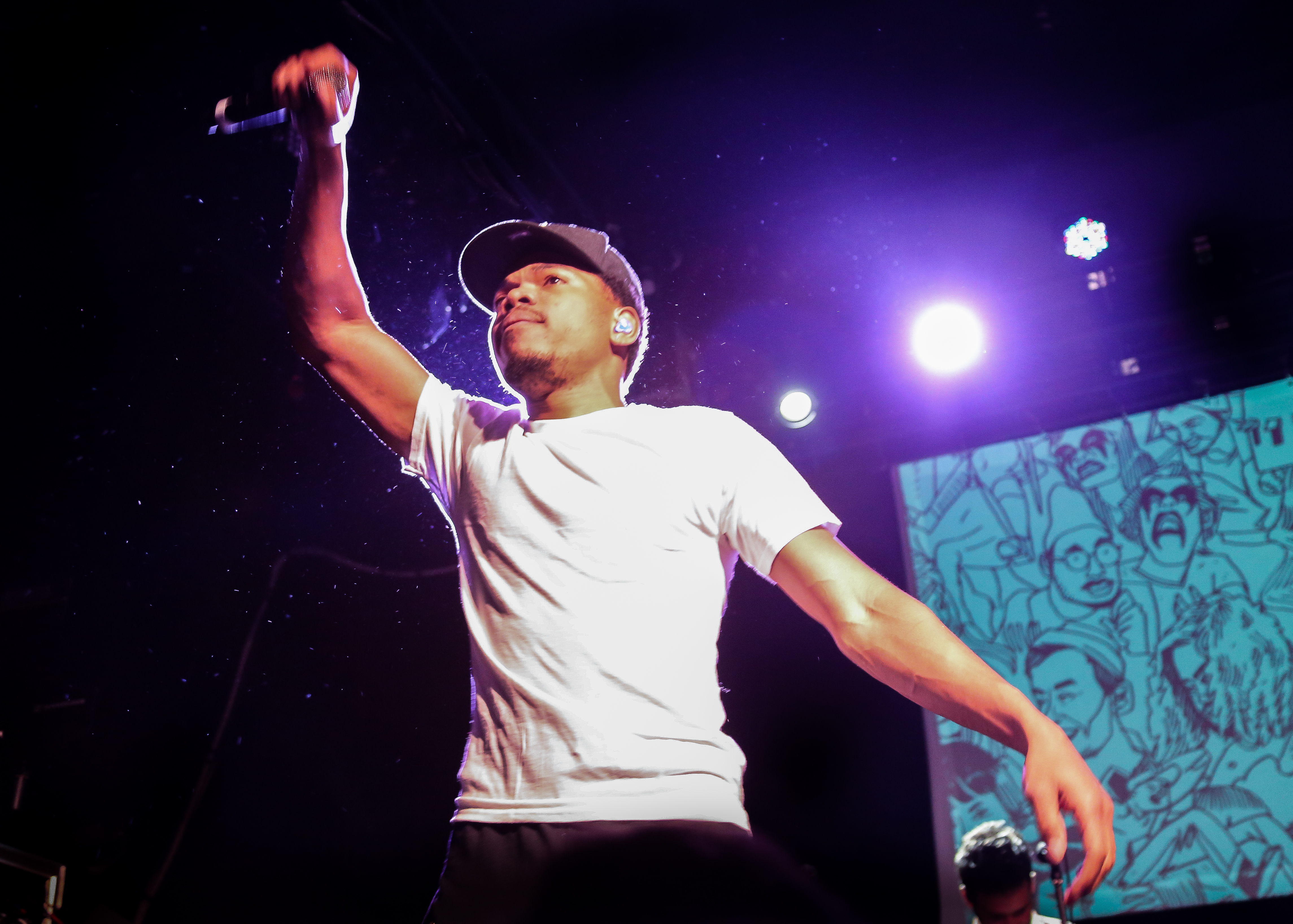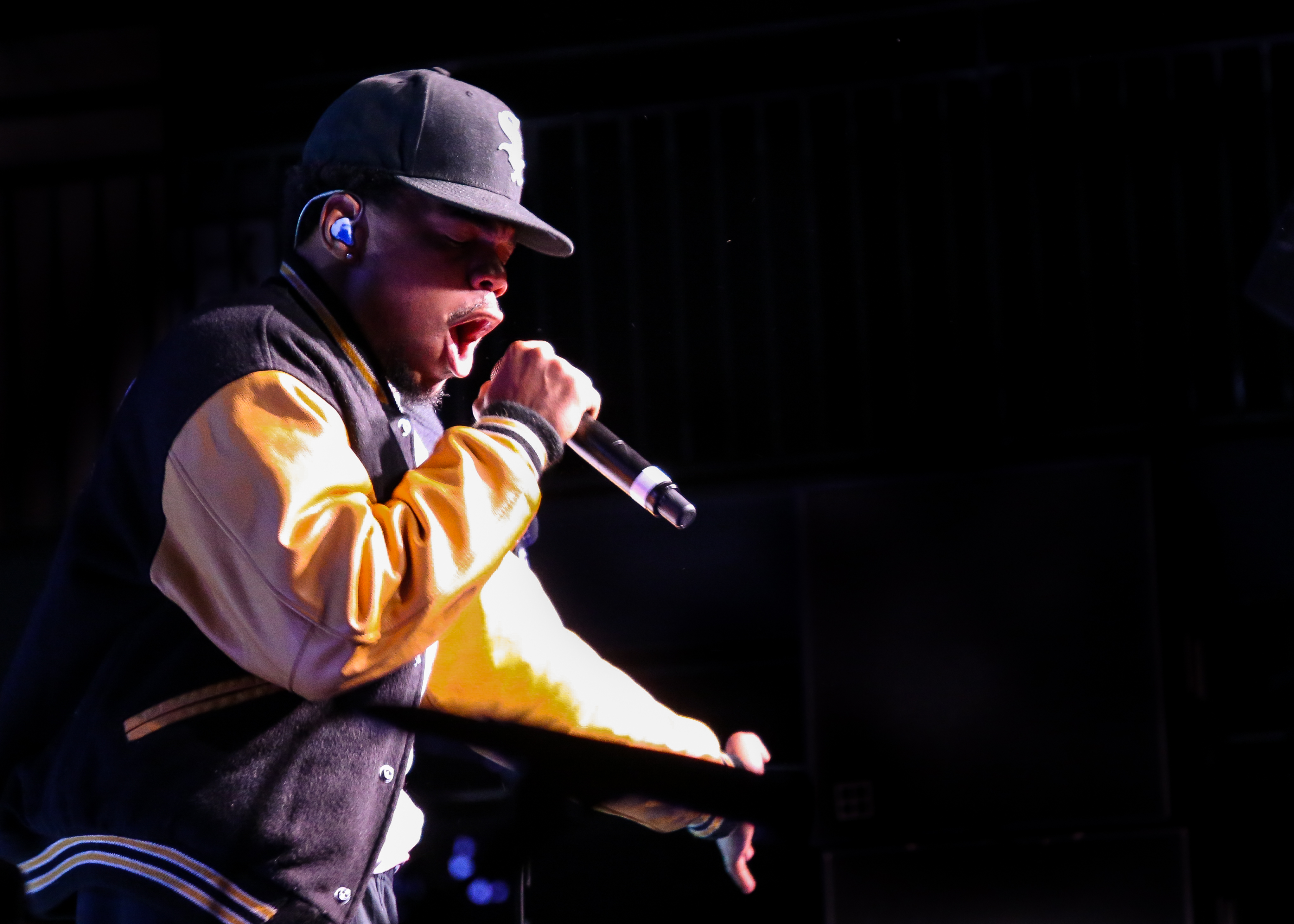 Chance orchestrated band rhythm section hits with a flick of his wrist and a punch of his fist. The live band, an ultimate enhancer for a rapper, was crisp—smiles and nods exchanged between the two keyboardists on either side of the stage. They crackled with joy as Chance skittered across stage.