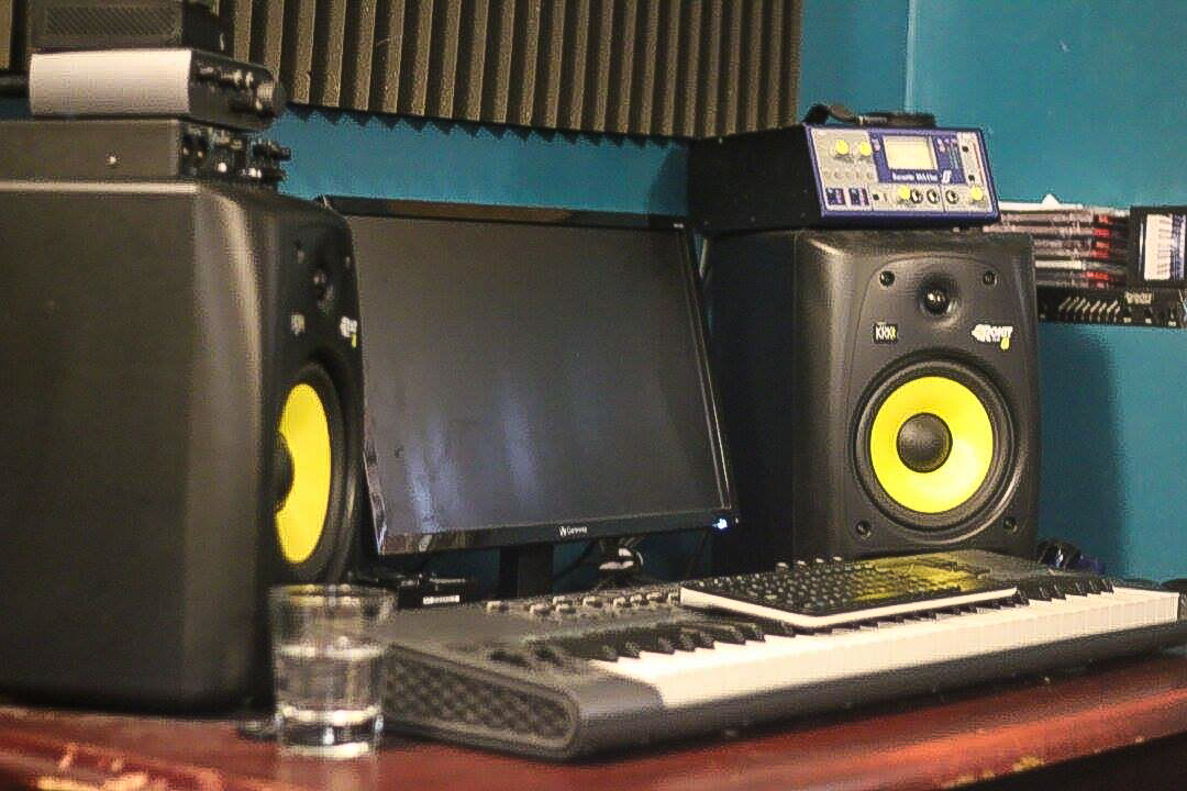 Along with the MV-8000 James owns four pairs of studio monitors, a stack of vintage keyboards—a Casio CZ-1000, an Ensoniq ESQ-1, a mini Korg, and MiniBrute. Does James have a studio, or a warehouse full of spaceships?