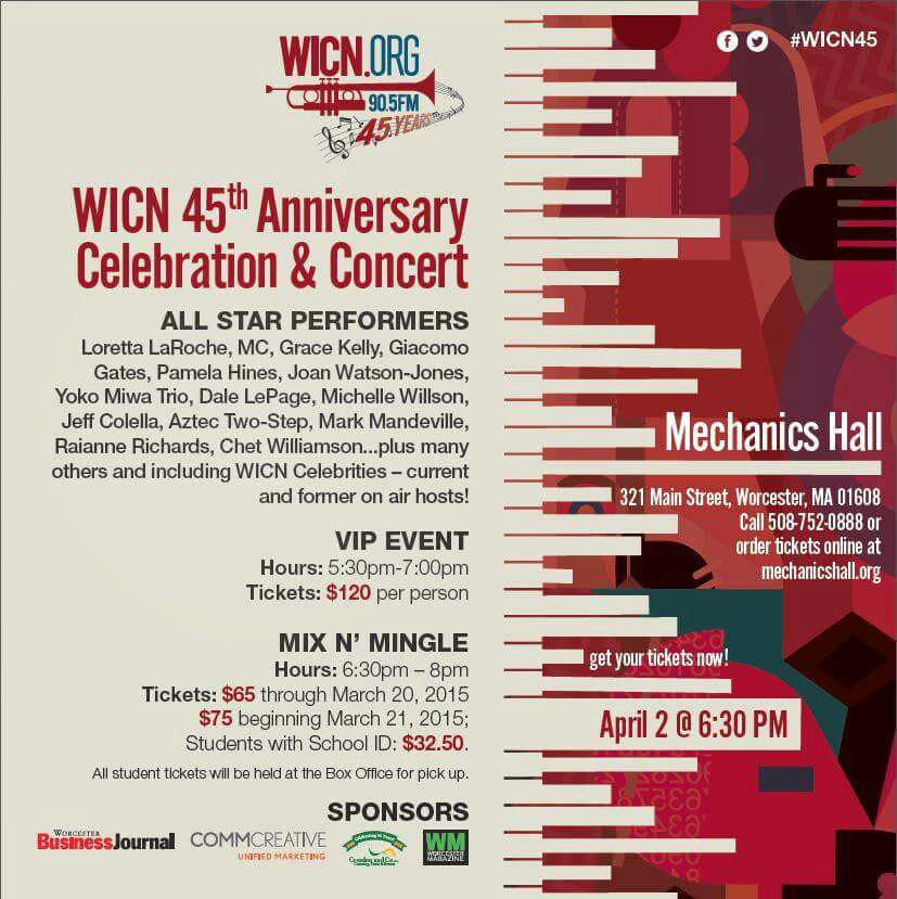 The 45th Anniversary Celebration will also feature the performances of Michelle Willson and Chet Williamson, who are active WICN hosts, as well as artists like Pamela Hines and Aztec Two-Step, who have deep roots within the Worcester community and a long history with the vaunted station.