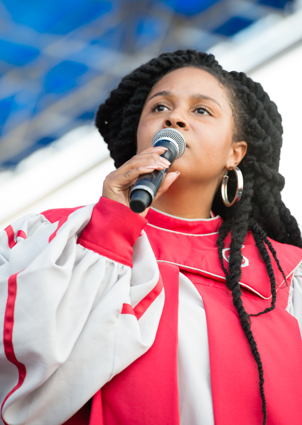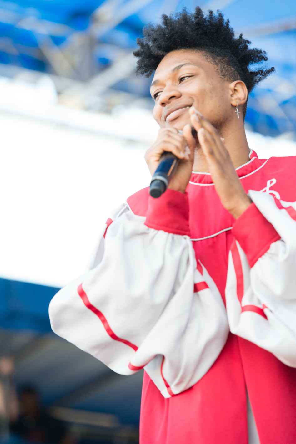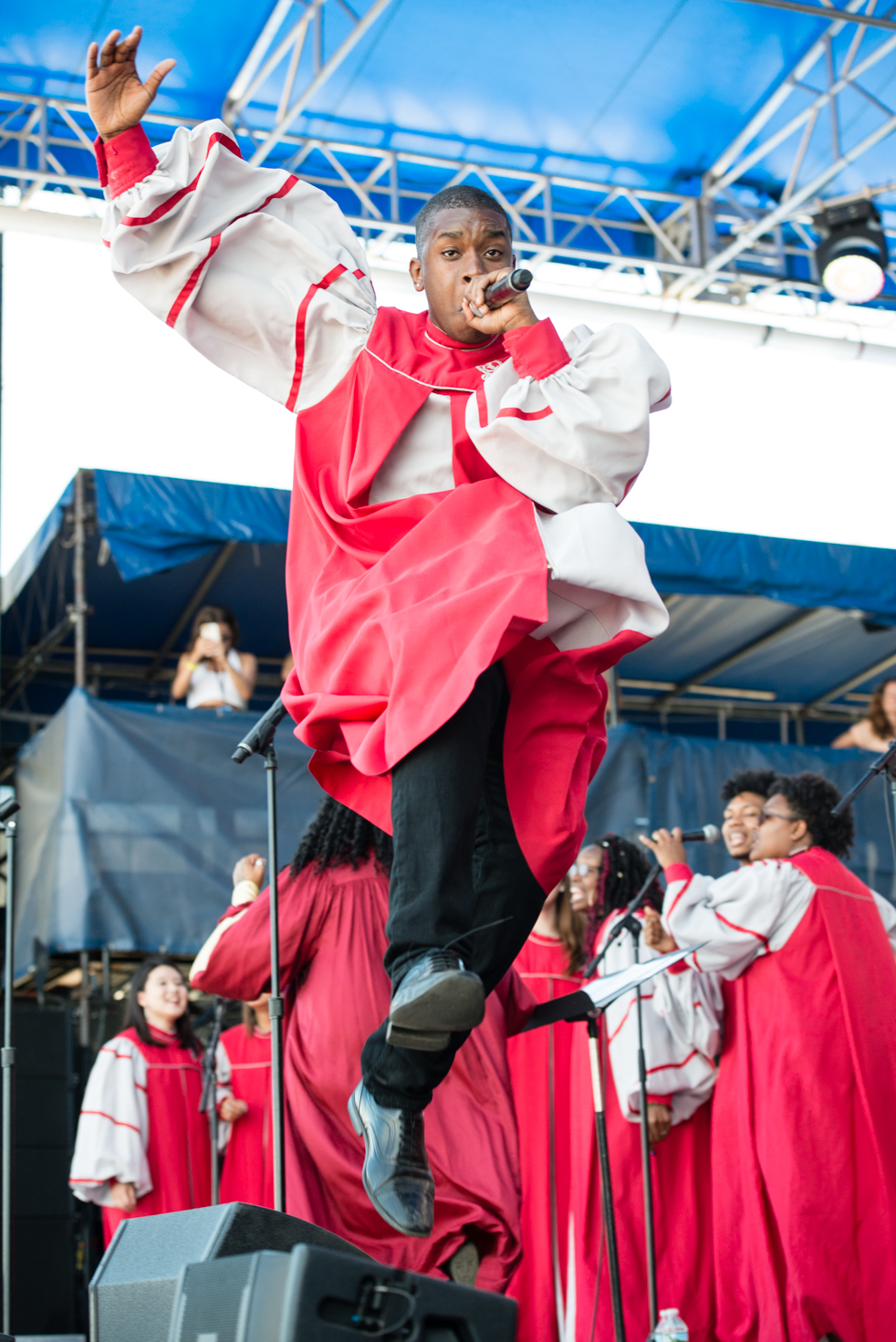 For the fourth year in a row, The Berklee Gospel and Roots Choir opened up the Fort Stage on Sunday. By the time their set was in full swing hundreds were clapping, spinning with arms raised, and singing their hearts out. Every few songs, a new leader would grab the wireless mic and the performance would take on fresh personality.