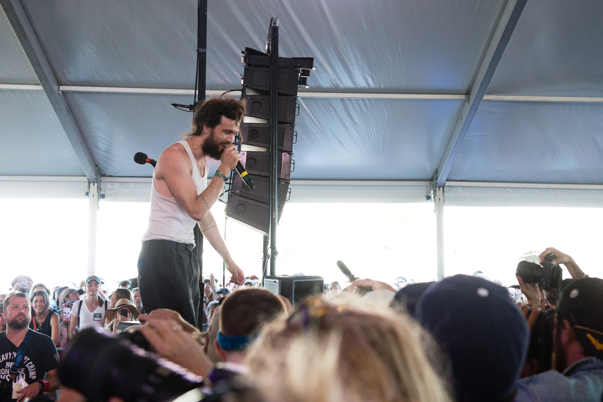 As veterans to the festival, it was clear by involuntary nonverbal cues that the band had been here and done that. Donning a wine (or was it blood?) stained sleeveless undershirt and pair of old slacks, Edward Sharpe weaved and wobbled his way around the congested stage. “Wow, there’s a lot of photographers,” he calmly noted. Escaping the confines of the stage and forty camera lenses in one single bound, he floated into the crowd, making merry arm-over-shoulder with fans.