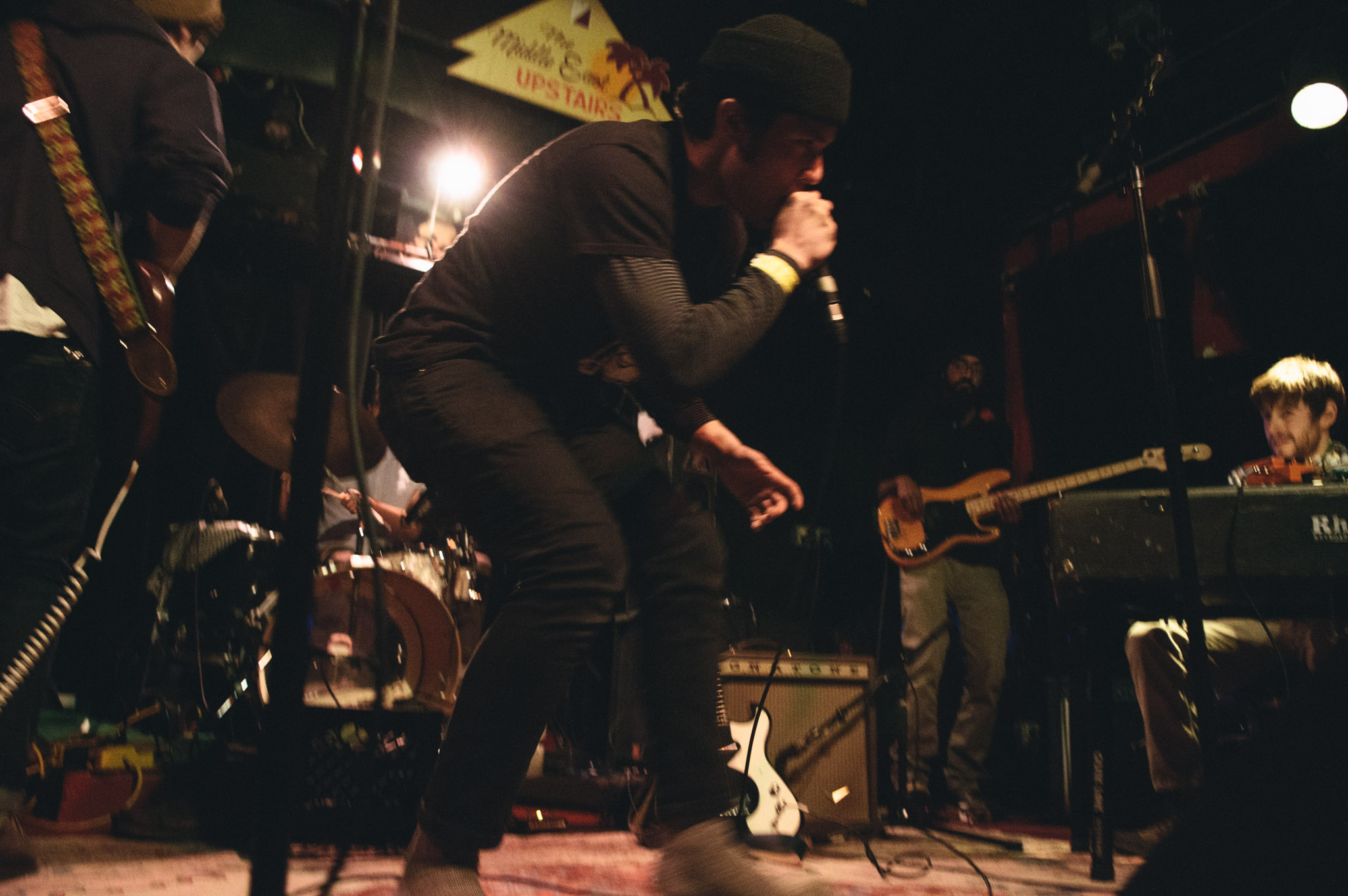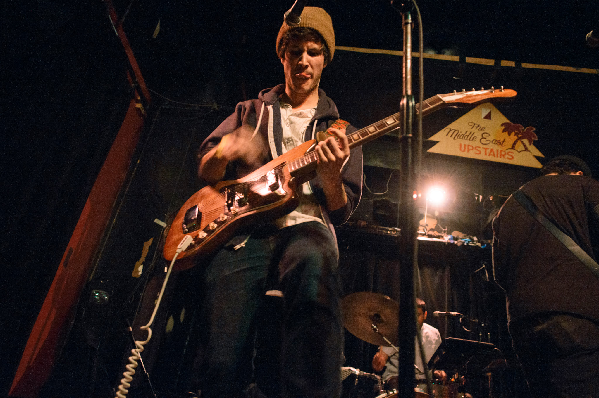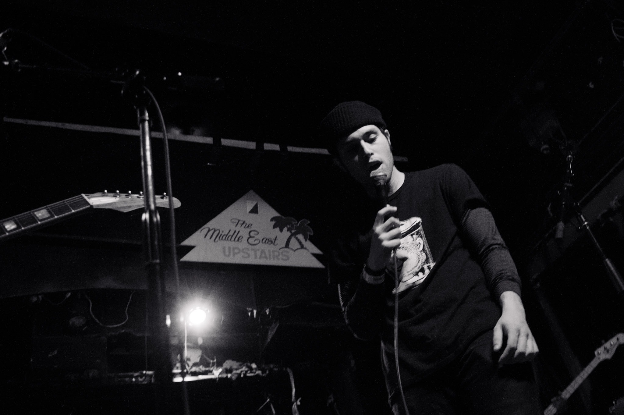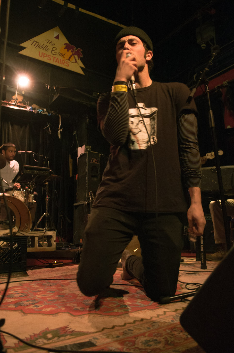 Hakim’s beanie-topped head and thick-lensed glasses—which he had to push back up the bridge of his nose throughout the night—didn’t quite match the suave voice on the album, but The Middle East isn’t exactly a venue for perfect, polished performances.