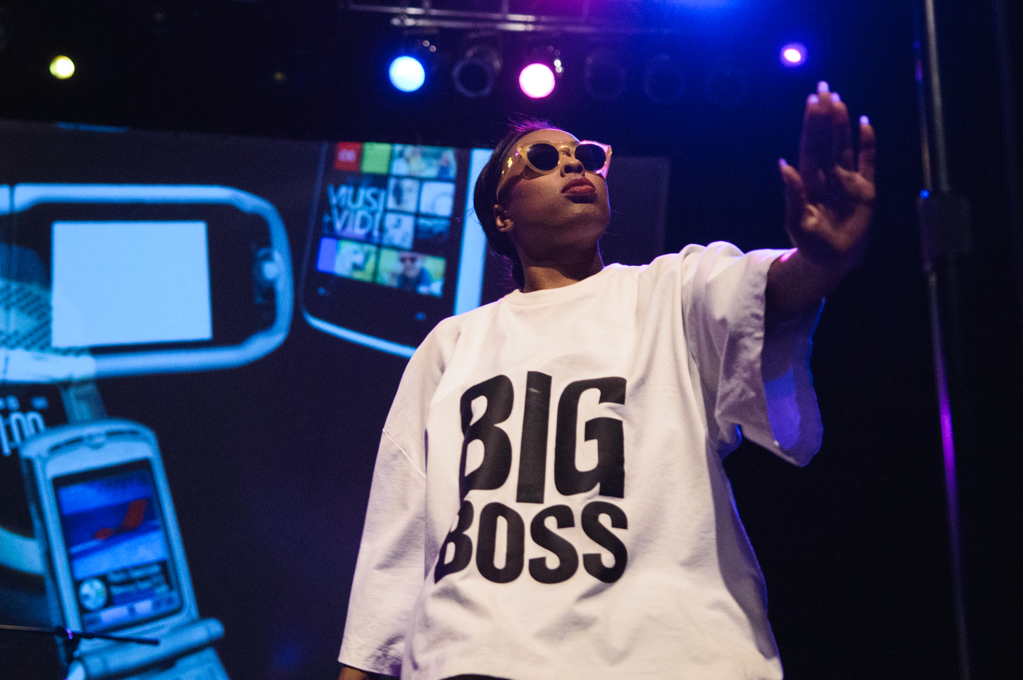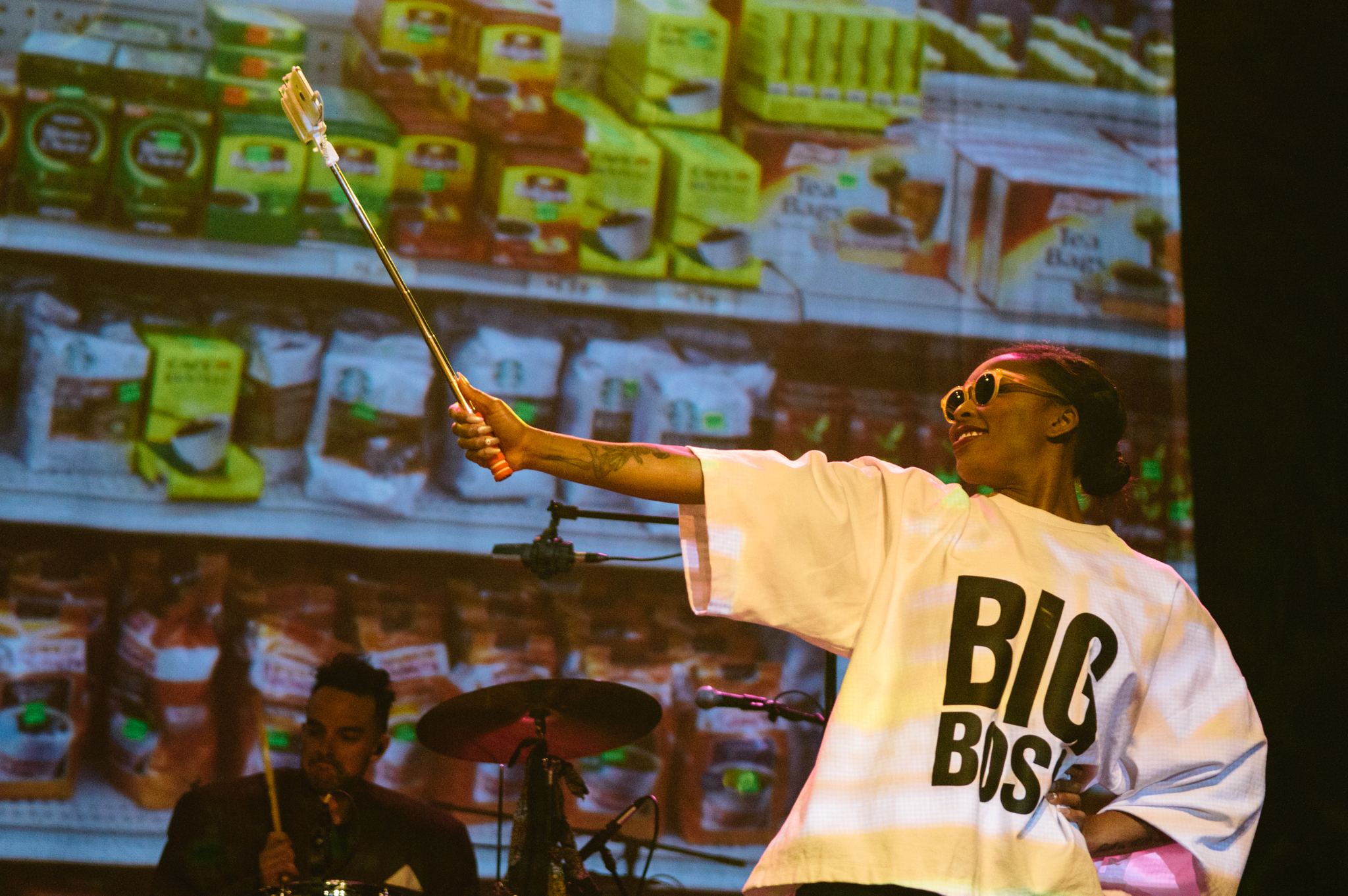 The duo sat down to munch on their orange cheese snacks with the what’re-you-looking-at faces of high school queen bees – an attitude to match their oversized “Big Boss” shirts. Meanwhile, Santigold strode on stage, chanting hit song “L.E.S. Artistes” as she shrugged the puffy shoulder pads of her oversized pinstriped suit.