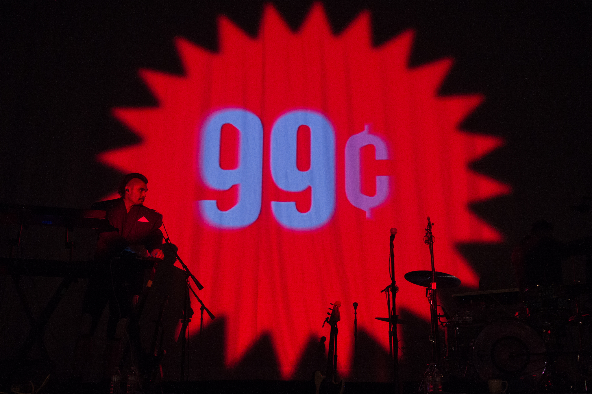 Throughout the show 90s computer graphic projections shone behind the band: The Sims-style renderings of spinning tanning beds and flip phones, dozens of dancing cats, time lapses of supermarket aisles, and hundreds of 99 cent price stickers flashed at the crowd.