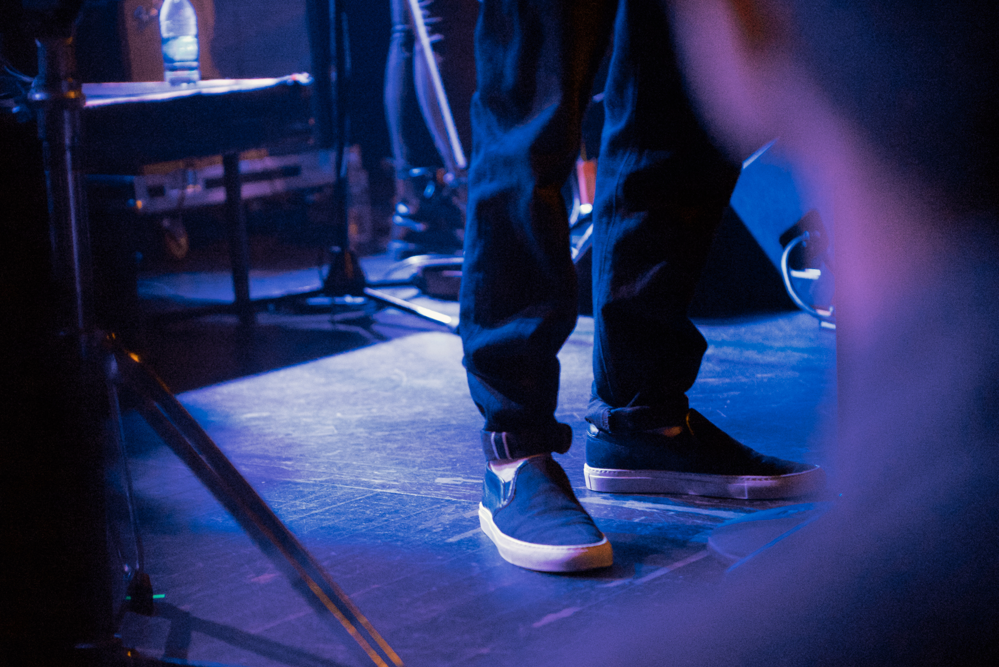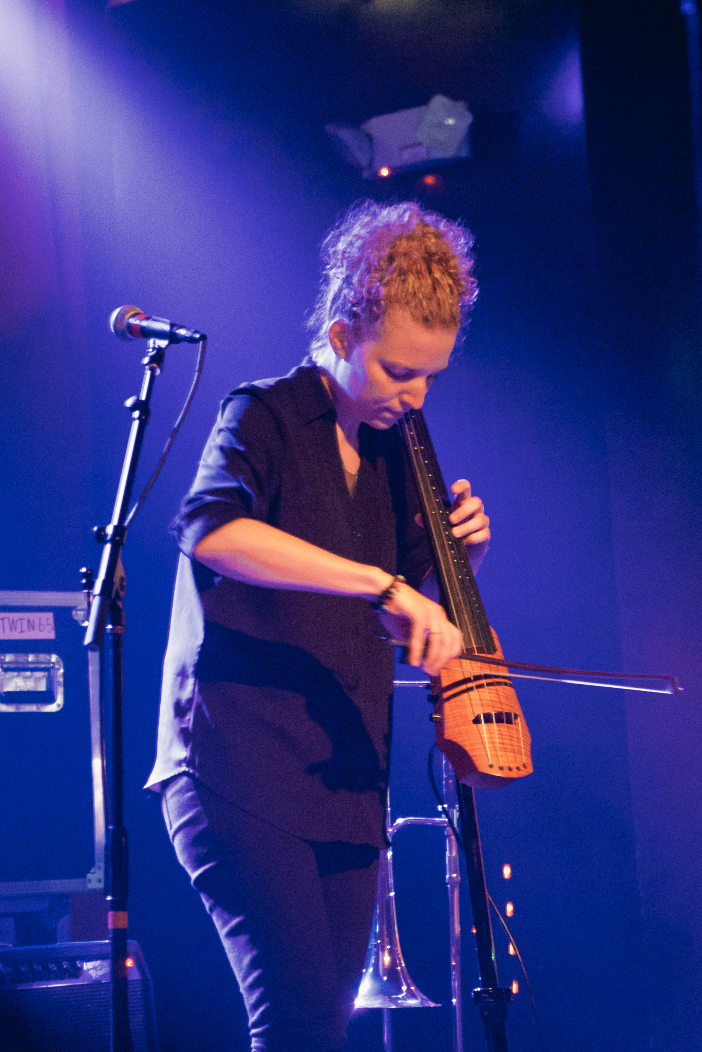 Groping around and tripping in the cluttered space, crew members prepared the stage. Void of musicians, yet already overcrowded with instruments, the stage housed a keyboard, drums, bass, violin, trombone, and an electric cello in anticipation.
