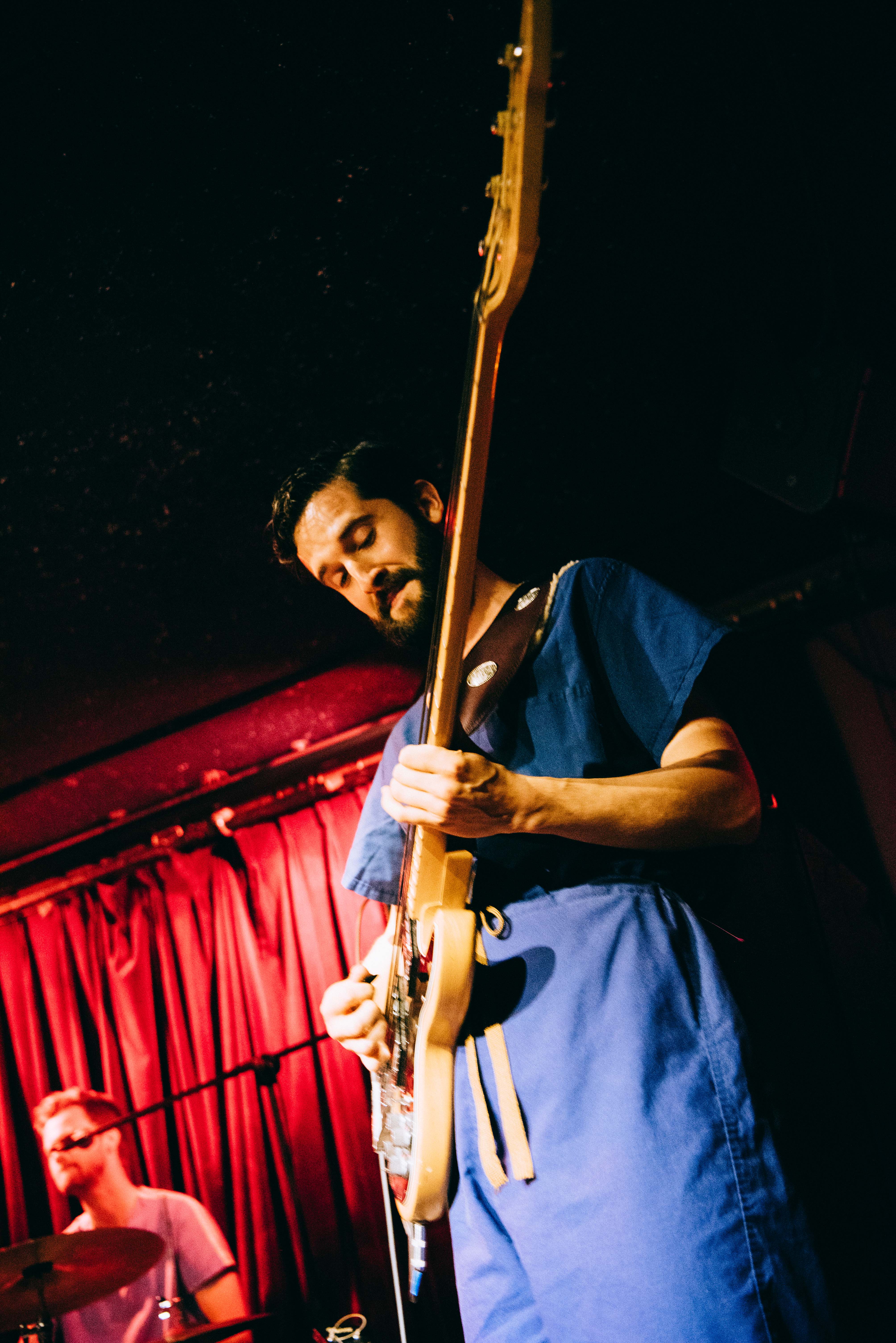 To the unsuspecting audience, hospital scrubs were a surprising sartorial choice for Sun Parade on the opening night of their tour. When the first four members appeared in white and blue scrubs to set up their instruments on the Lizard Lounge stage, they did so with a curious nonchalance. Their clothes were clearly in jest, but the joke was unclear. At that point, vocalist and guitarist Chris Marlon Jennings sat down wearing nothing but sunglasses and a short hospital gown, which revealed the thick cast on his left ankle. The room filled with scattered laughter as the audience slowly understood the punchline. “Break a leg!” a fan shouted as the grinning band began to play.