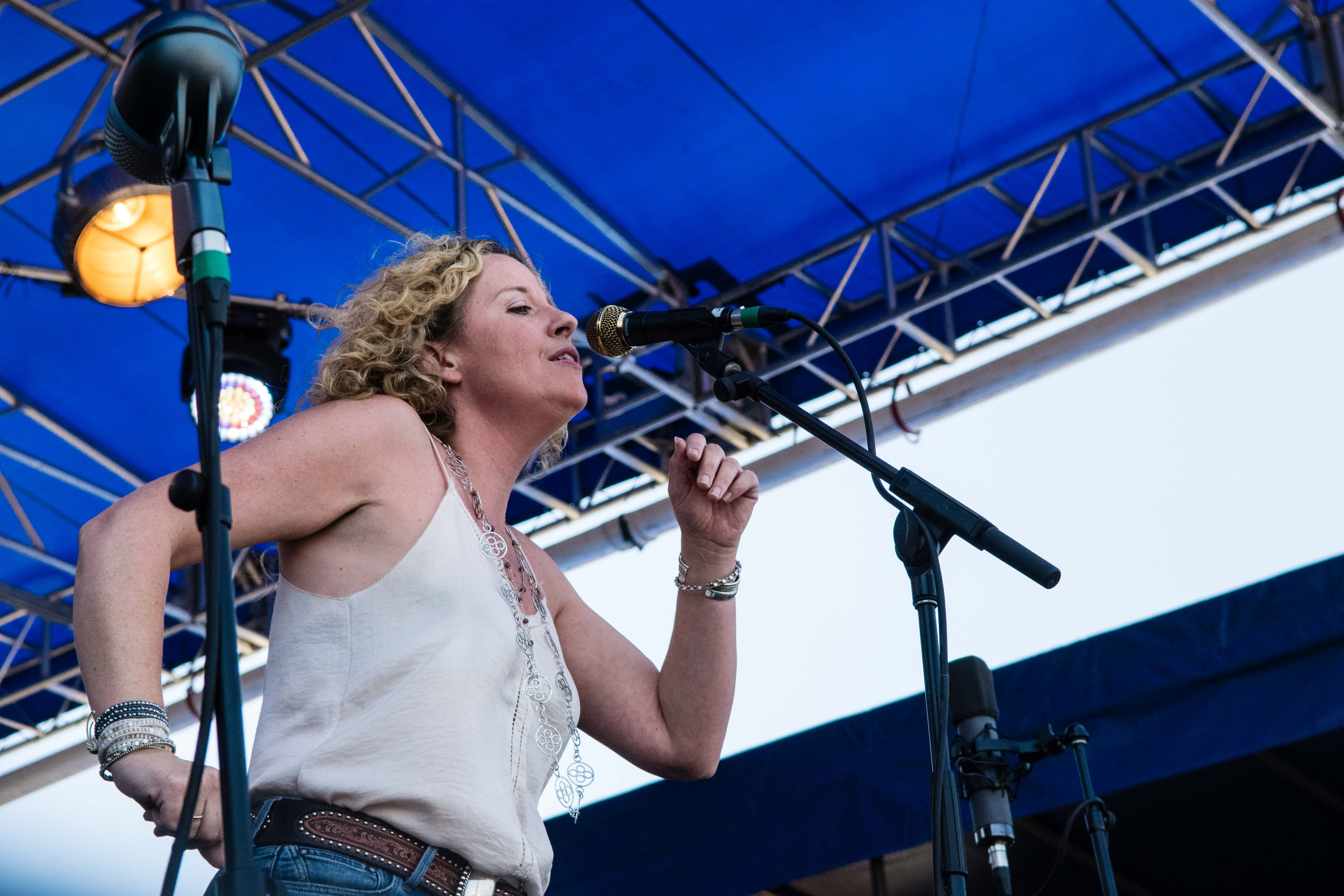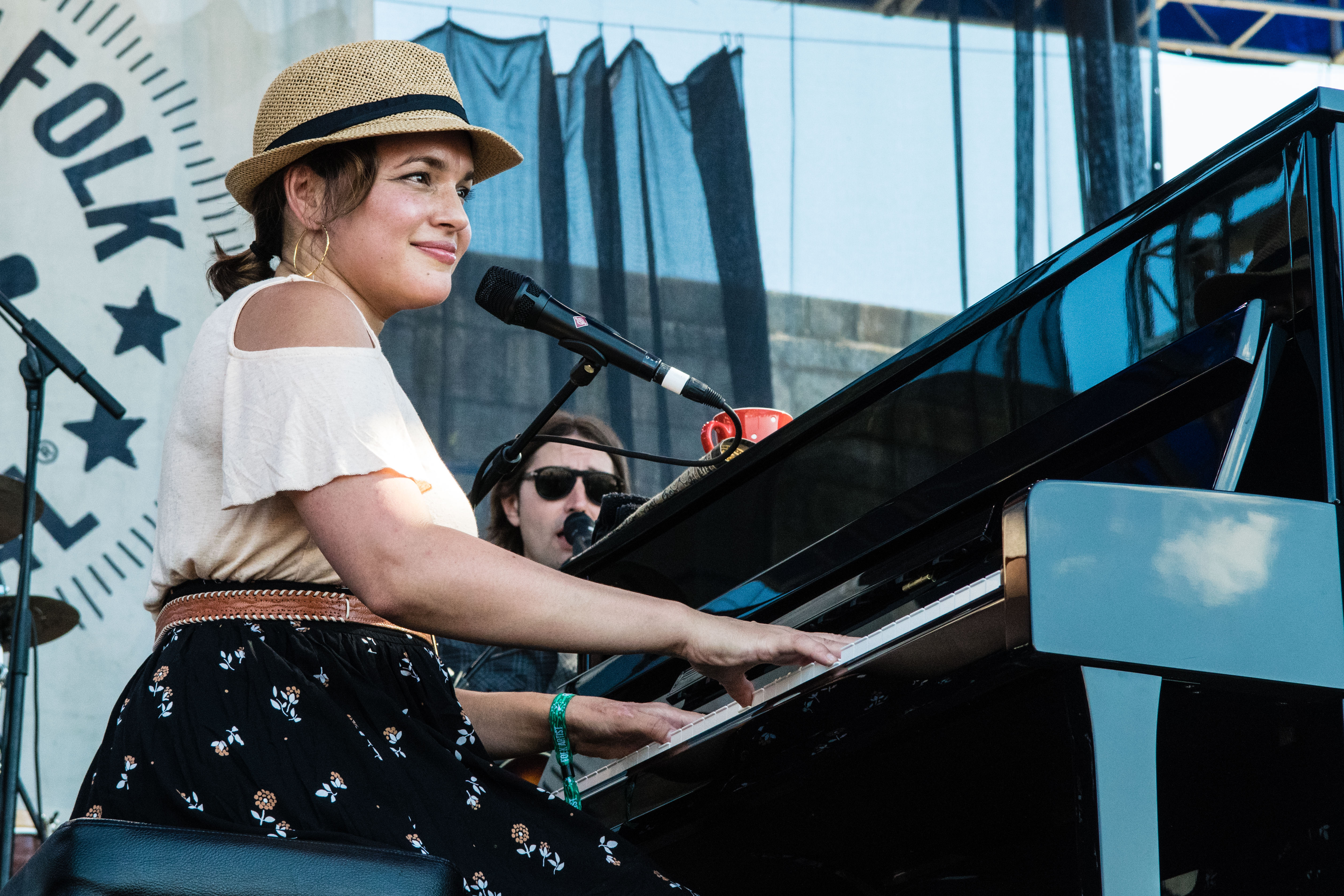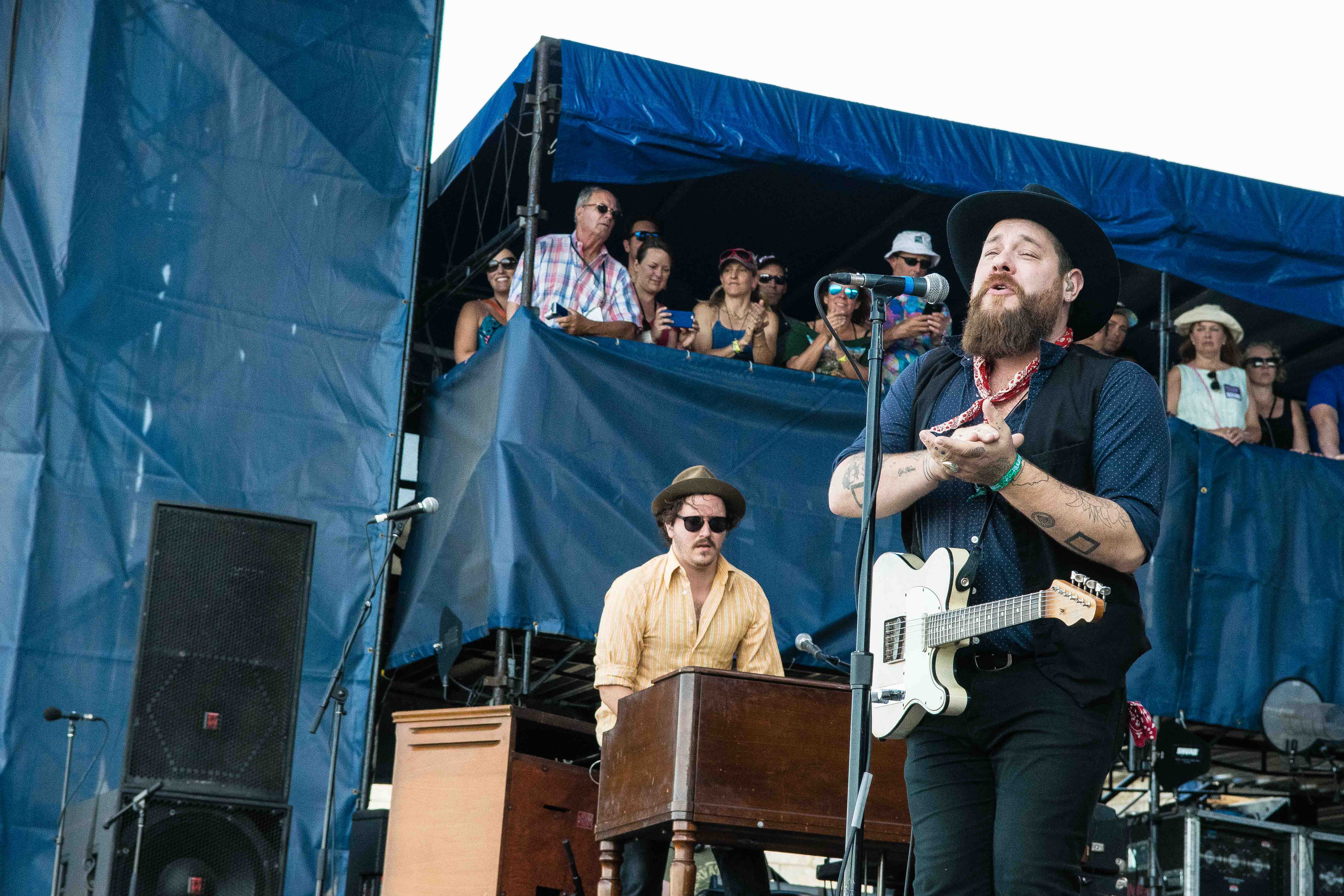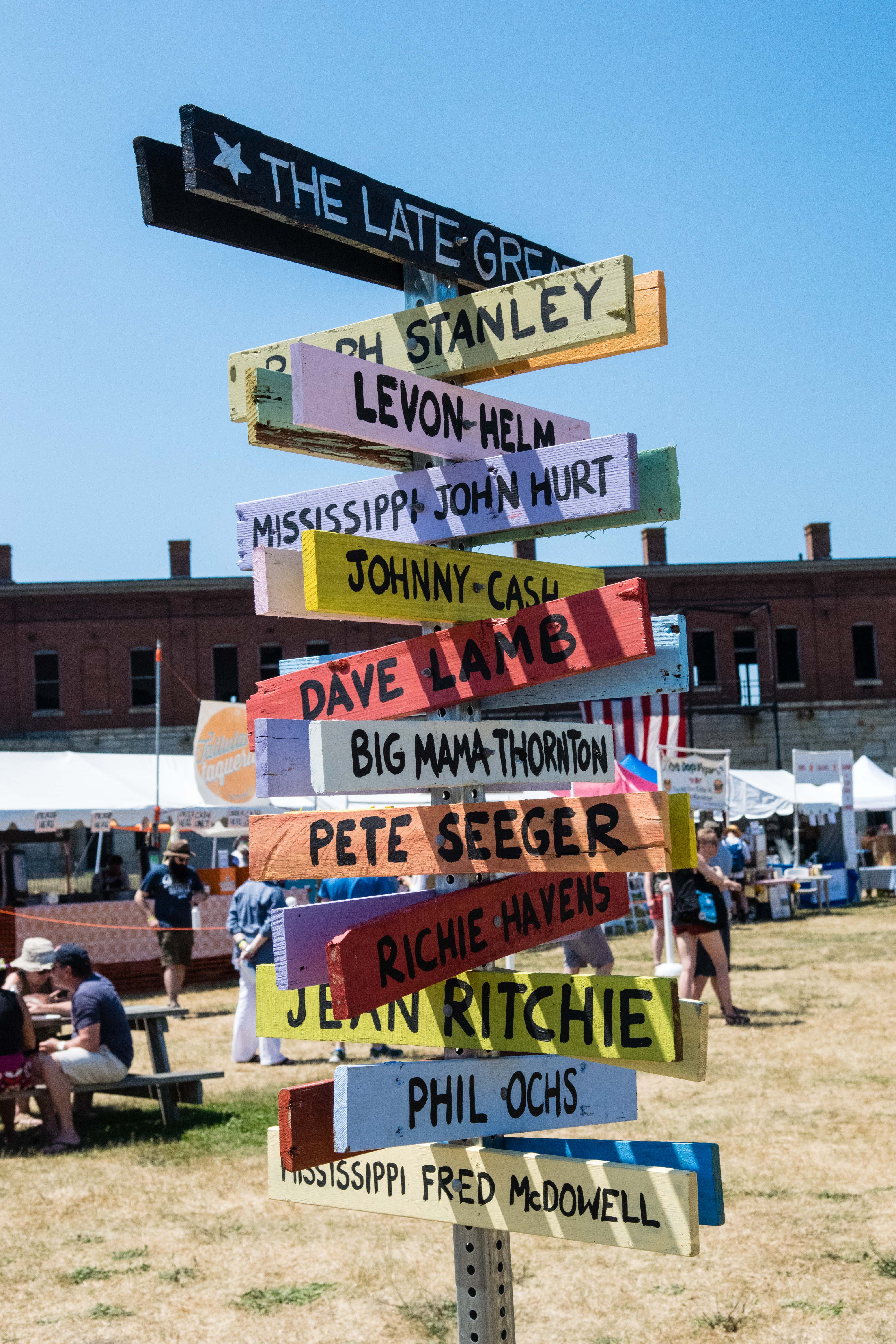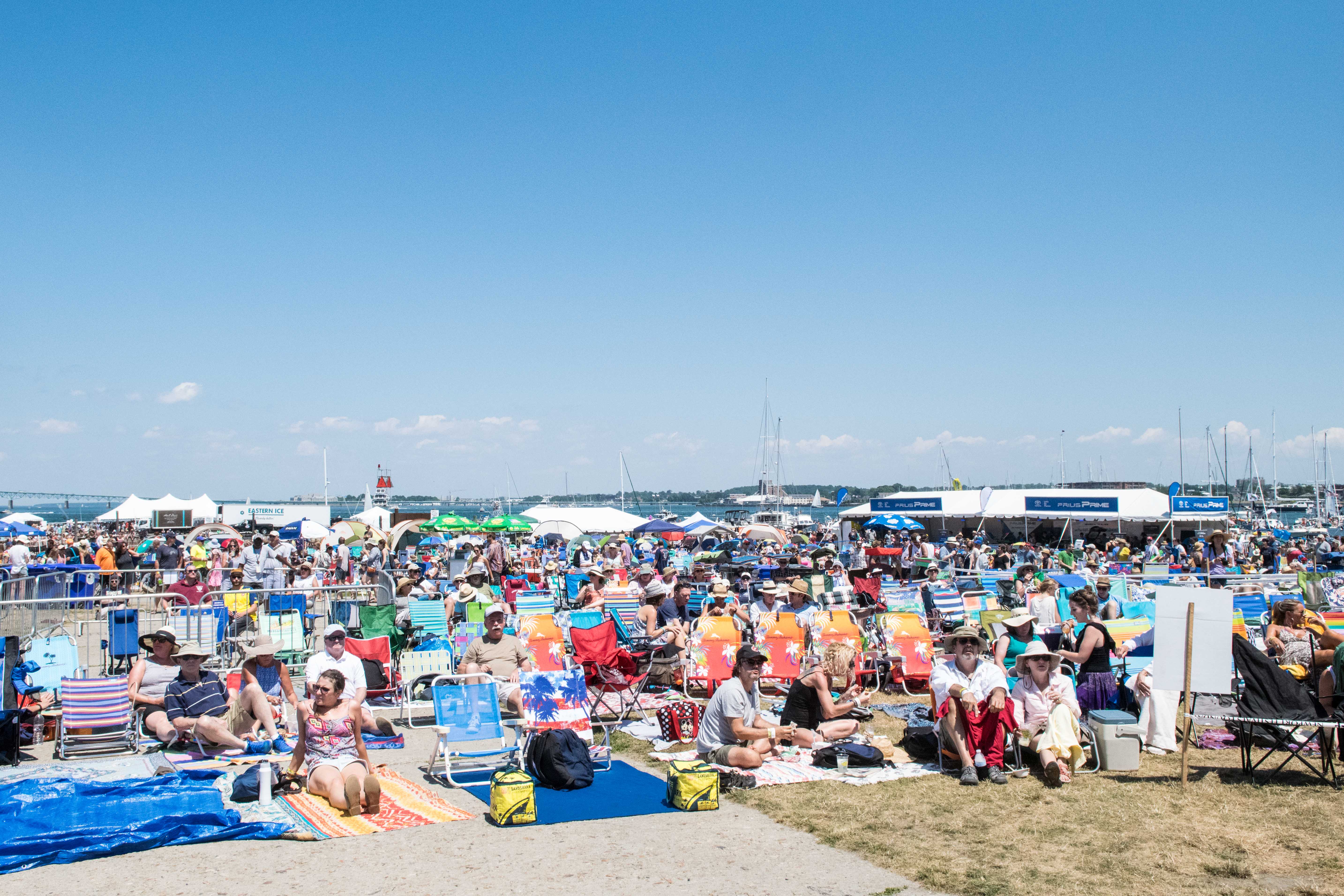 Tank tops and t-shirts were dotted with sweat. Water droplets dripped from paper cups of Del’s Lemonade. The smell of candied nuts wafted through the muggy air. With white sailboats floating in the bay behind the Fort Stage, onlookers sat in beach chairs and tipped back bottles of water. It was 98 degrees—everyone was boiling, but happy.