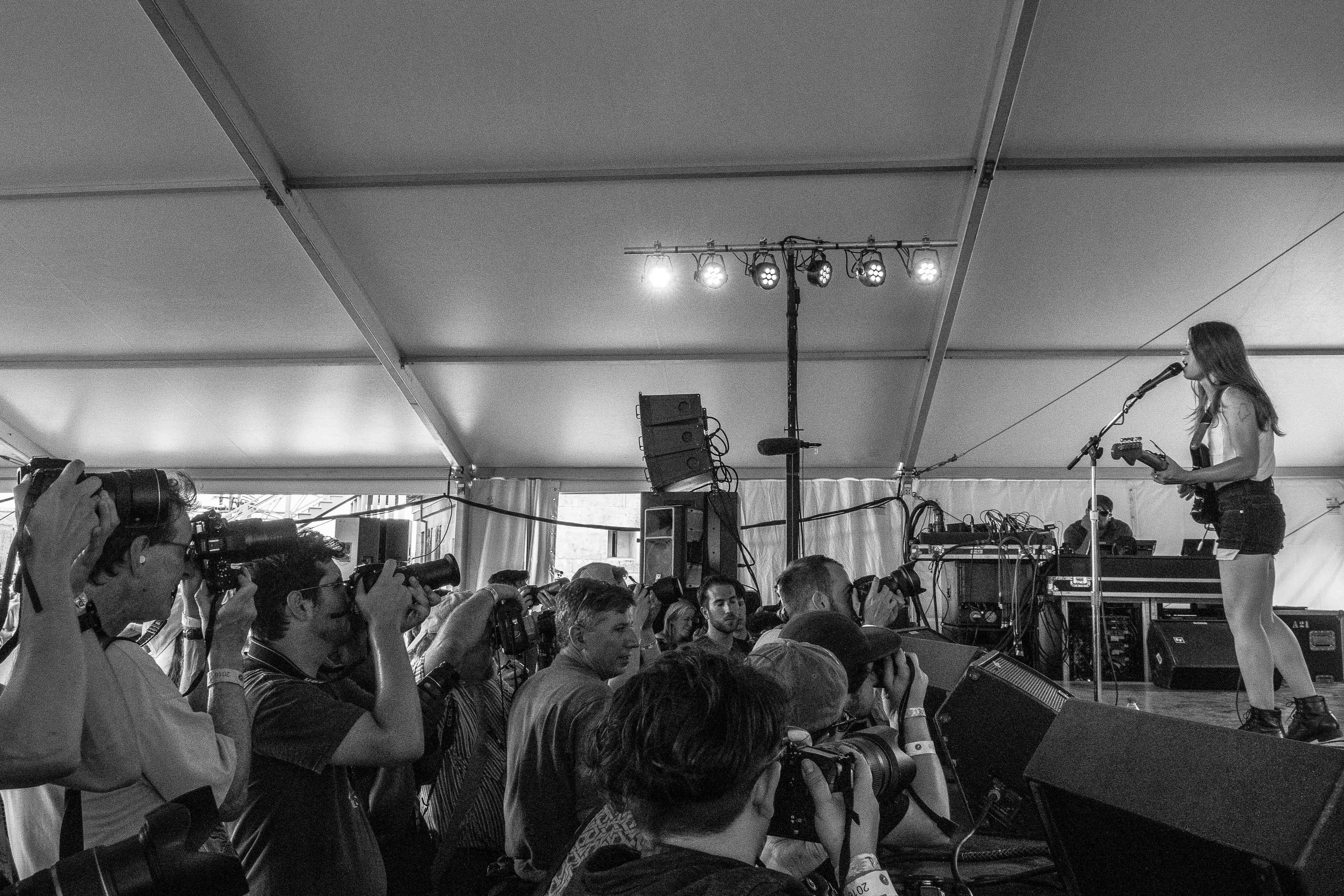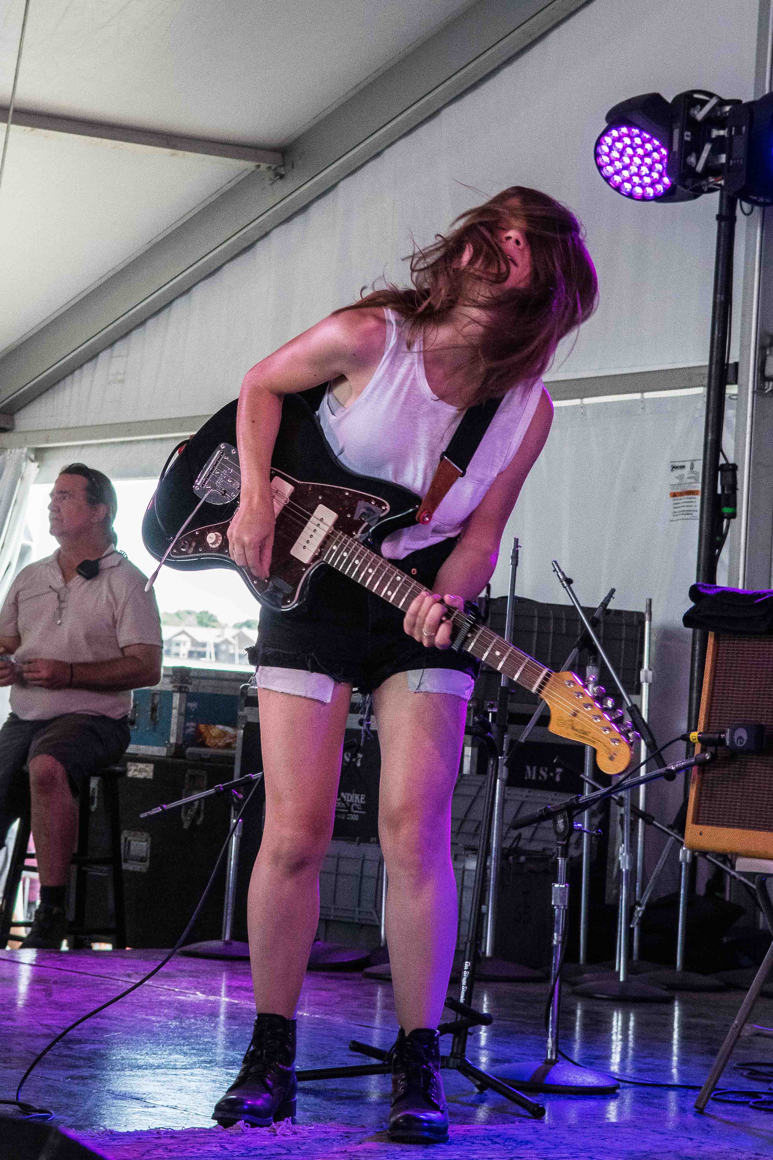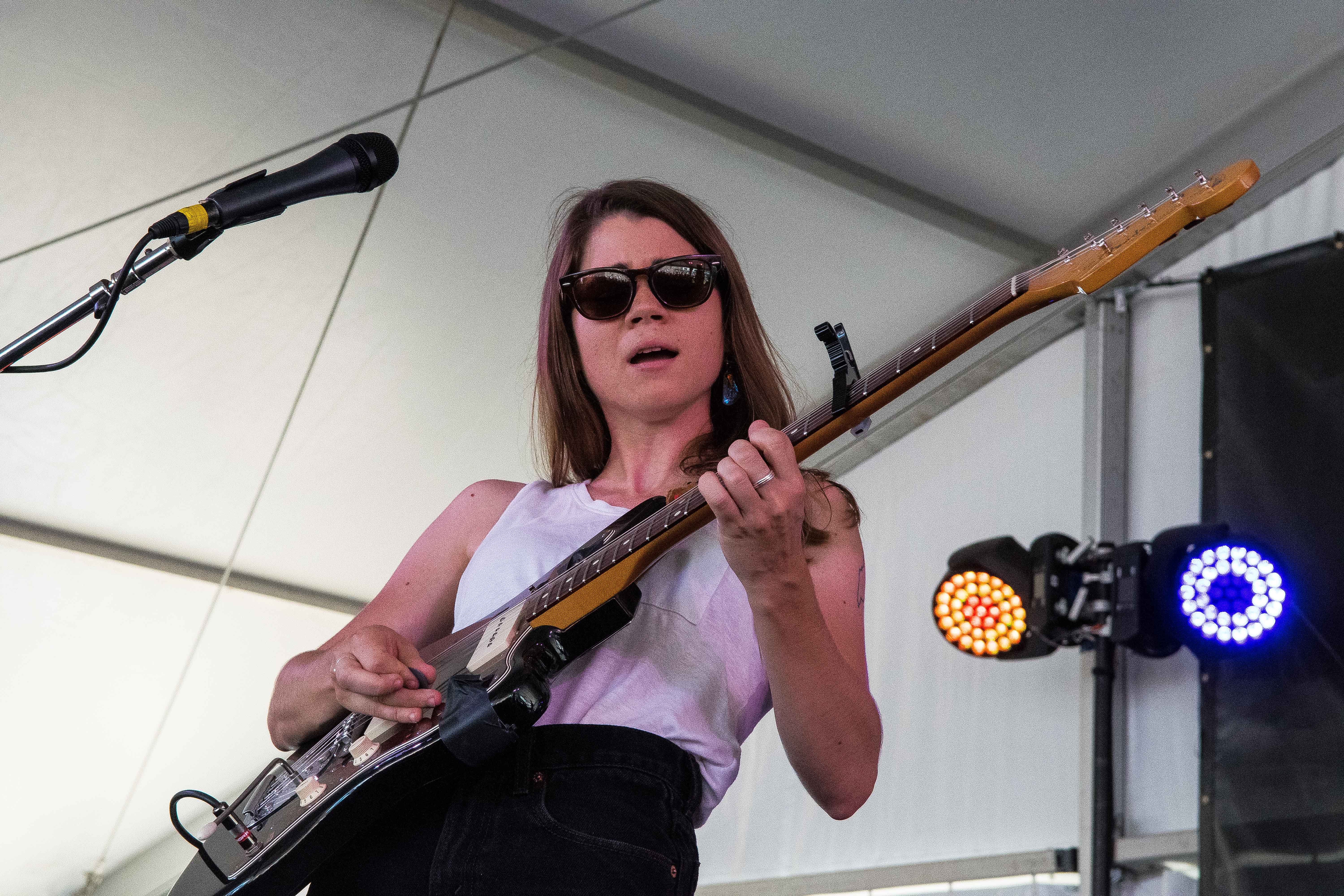 Spaltro’s set was accented with cymbal crashes that echoed throughout the tent. Her sound, a hybrid of folk and punk, relies on layers of light distortion, which Spaltro manipulates through her pedal board. Leaning back with her electric guitar in her arms, she stomped and strummed to the Harbor Stage crowd.