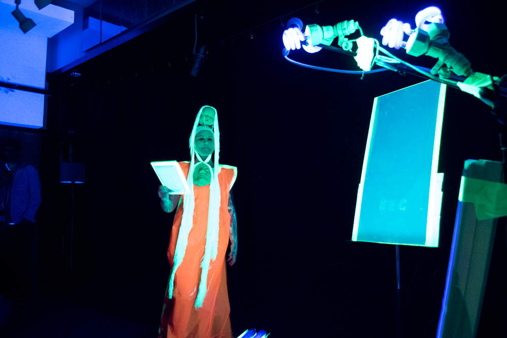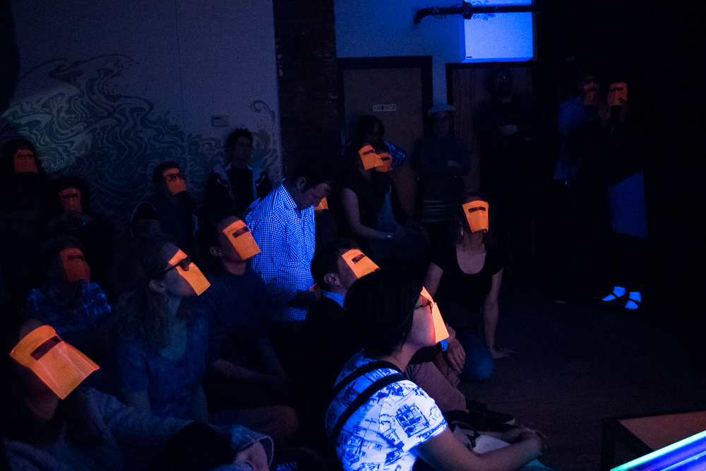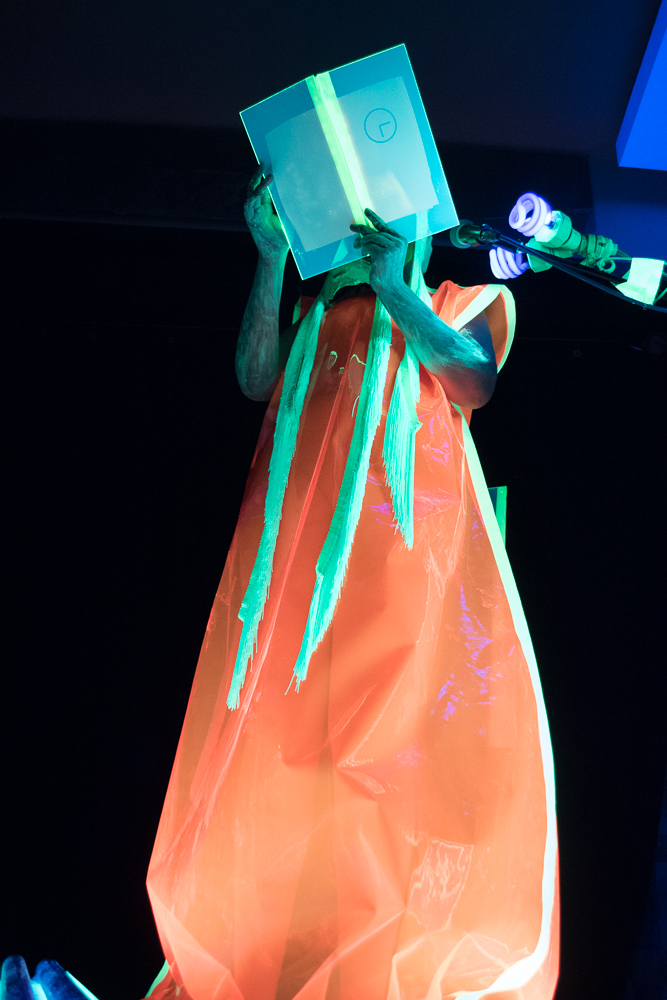 Crichton Atkinson, painted and poetic, then told her spoken word tale of time, bodies, and space while covered in blacklight paint, fluorescent plastic, and masks.  A baby doll head perched on her head and an old man face wrapped around her neck. “We are stardust in action,” she noted. “Time is the equalizer. The actions that happen are the only actions that could happen. And times goes on.” She mesmerized the crowd, whose glowing orange-masked faces remained upturned and focused on her words.