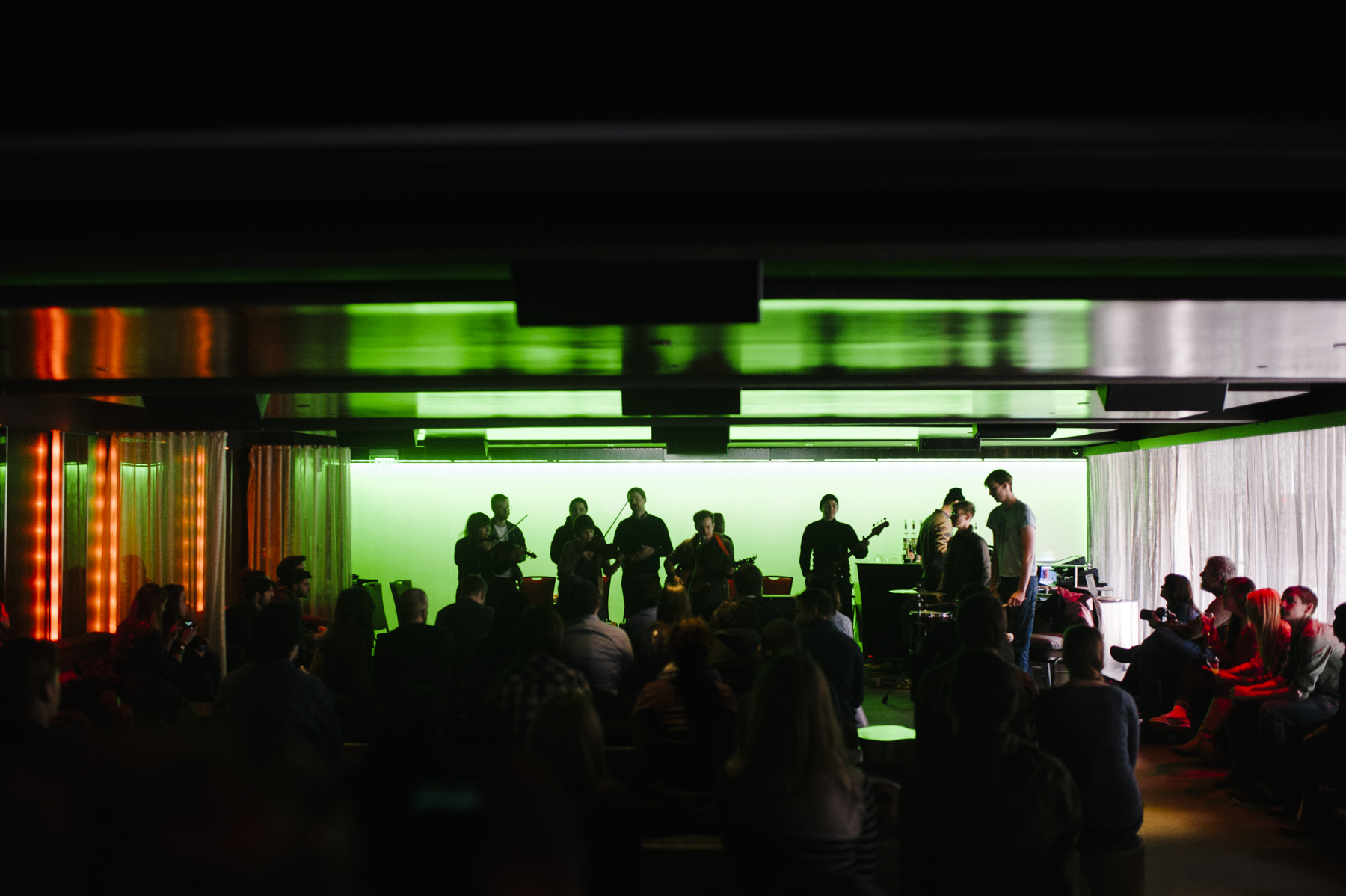 With the show being kept fairly brief for a headlining band with a catalogue like theirs, Typhoon was committed to channeling their music to Boston, and made available a free “acoustic” show  at the Emerald Lounge in the Revere Hotel on Sunday afternoon. The relaxed atmosphere of a packed lounge wasn’t exactly what you’d expect to want to see a huge anthemic orchestra perform in, but they held the space exceptionally well.