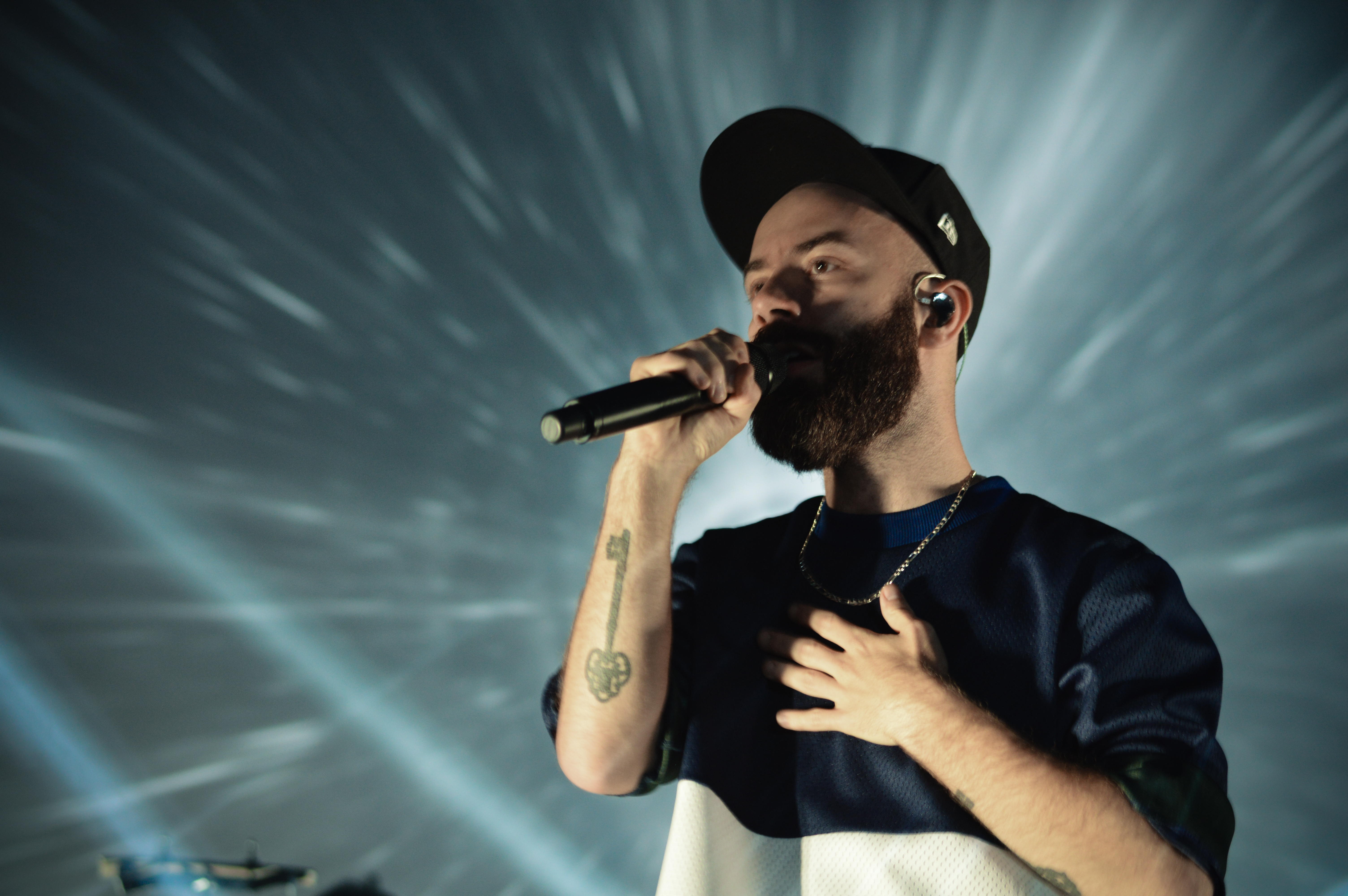 Now usually, the lighting of a set is nothing exceptional. To say Woodkid’s light show was an essential part of the performance would be no exaggeration. Of course, we should have expected it; after all, as a music video producer he’s all about the visual. Columns of white light beamed up from the ground – great towers that transformed the stage into his fortress. And while he could have easily charmed us by projecting his beautiful black and white music videos, instead he played seemingly alien landscapes: mountains and ocean waves, intricate rock carvings and building exteriors. The whole performance felt as if the Blue Man Group collided with an orchestra, and at the head of it all was Woodkid, who after singing his part turned to face his band and wave his hands like an orchestra conductor – but with the swagger of a rapper.