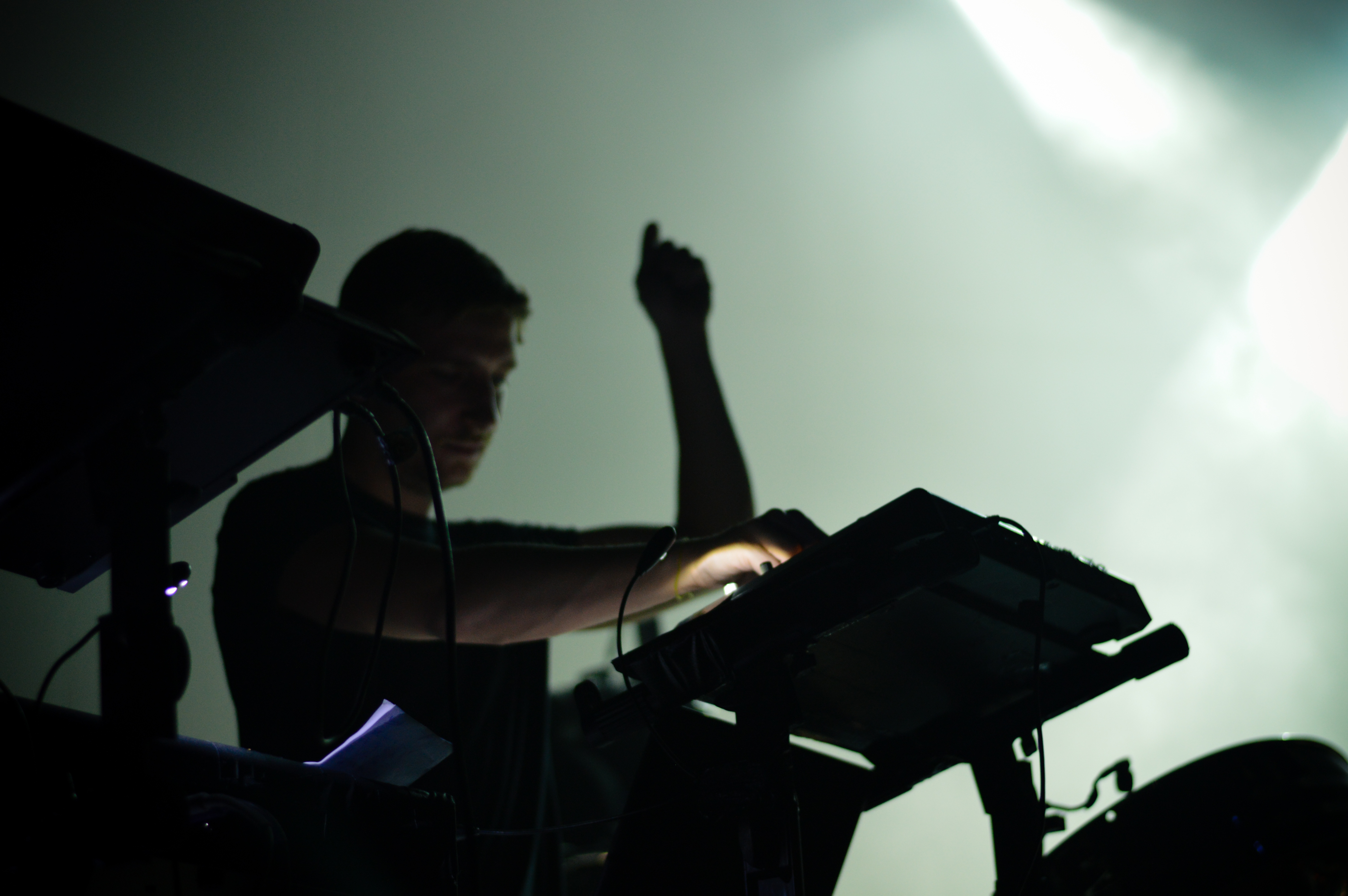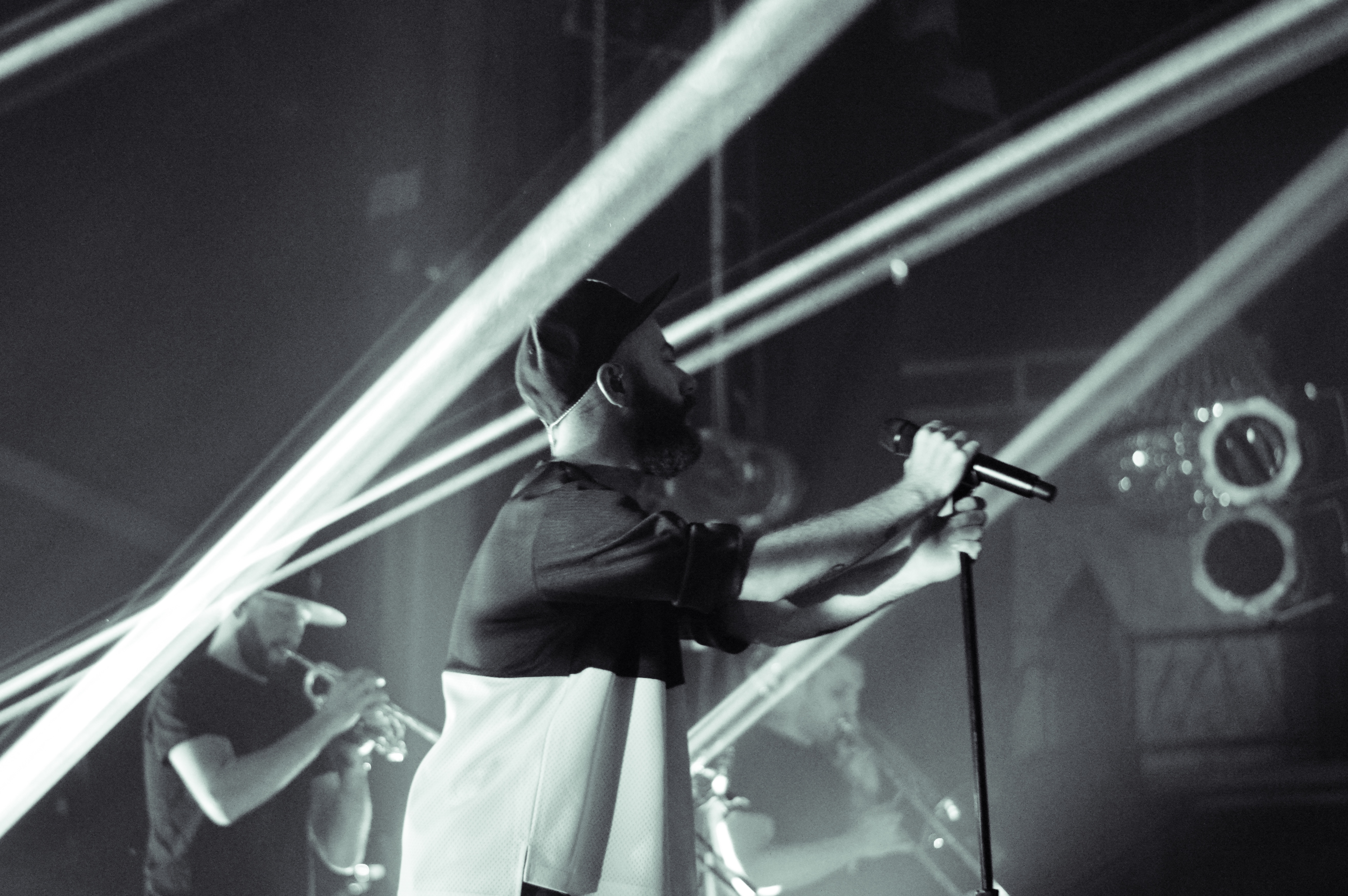 Throughout the concert Woodkid retained his signature aesthetic. Save for the dark blue and green of his shirt and one one grim rumble of red light that matched an especially low note of the horns, the performance was entirely black and white, just like his award-winning music videos.